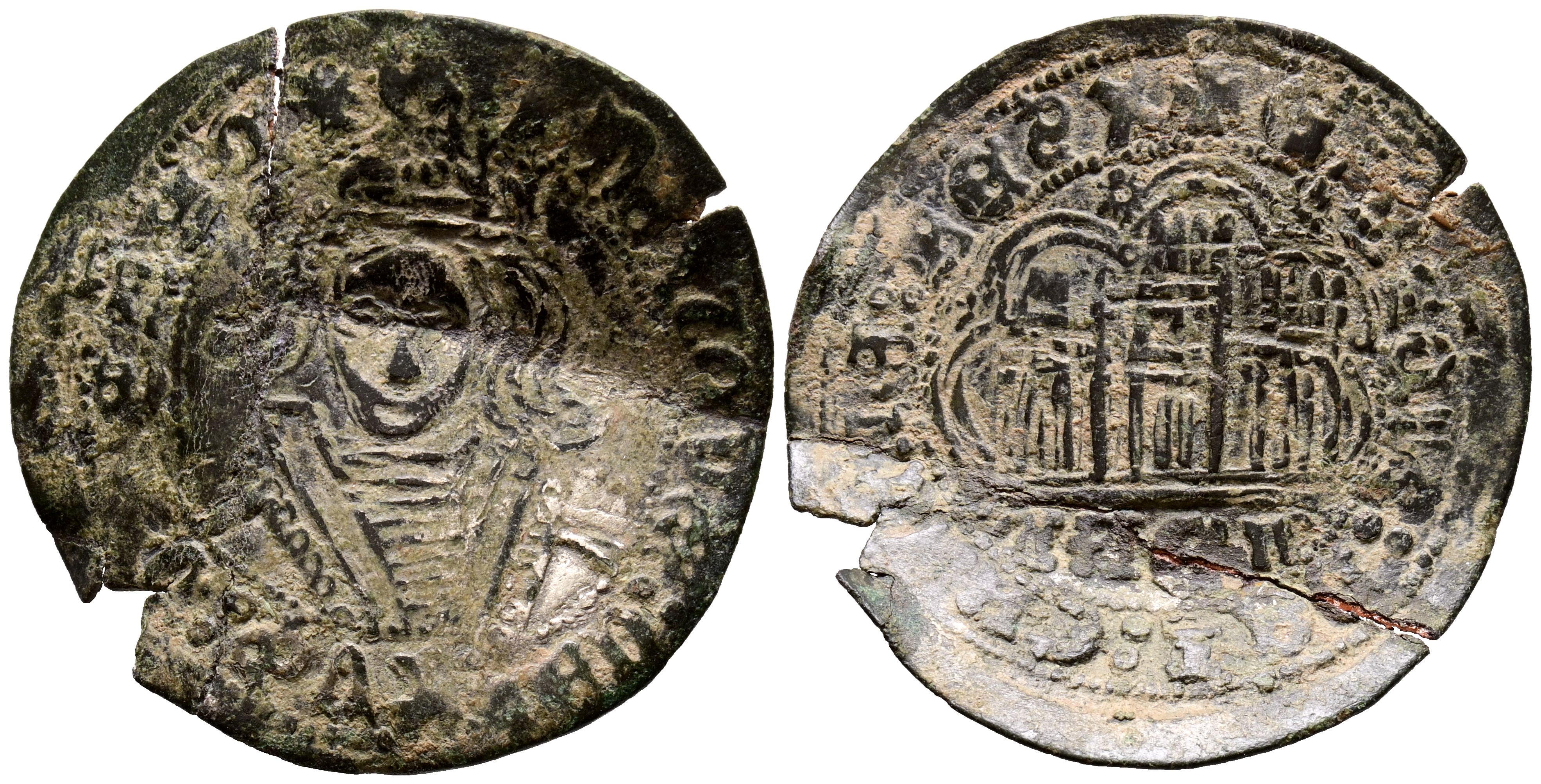 English HENRY IV (1454-1474). Quart. (Ve. 3.05g/27mm). Jaén. (Imperatrix E4:14.97; FAB-746). Obv: Crowned bust of Henry IV facing forward, around the legend: ENRICVS CARTVS DEI GRA. Rev: Castle within lobed beading, below: IAEN, around the legend: ENRICVS DEI GRACIA REX. VF-. Warped and cracked due to folding. Remains of original silvering.