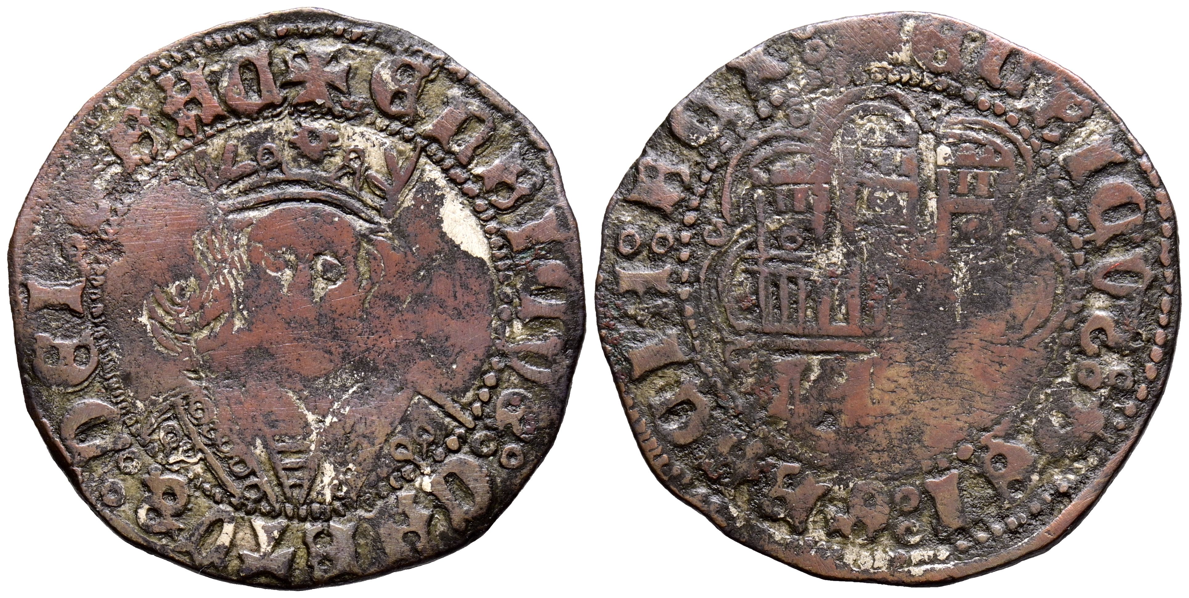 HENRY IV (1454-1474). Quart. (Ve. 3.50g/27mm). Jaén. (Imperatrix E4:14.97; FAB-746). Obv: Crowned bust of Henry IV facing forward, around the legend: ENRICVS CARTVS DEI GRAC. Rev: Castle within a lobed beadwork, below: IAEN, around the legend: ENRICVS DEI GRACIA REX. VF-. Cleaned.