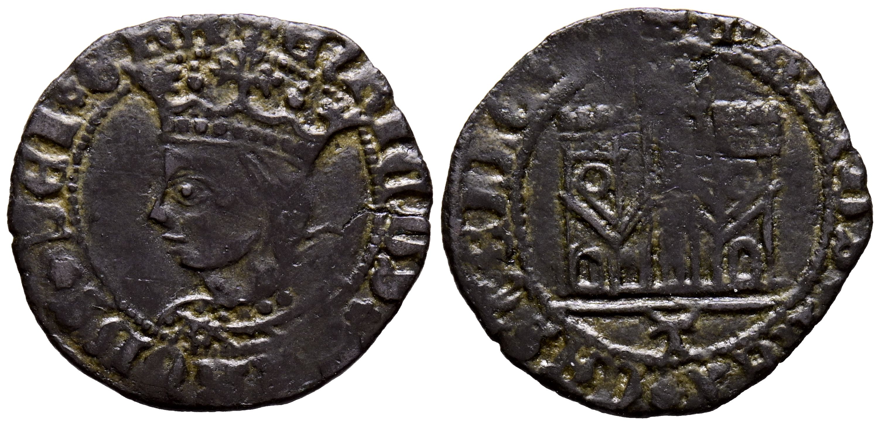 HENRY IV (1454-1474). 1/2 Quart. (Ve. 1.41g/21mm). Toledo. (Imperatrix E412.11; FAB-788). Obv: Crowned bust of Henry IV facing left, around the legend: ENRICVS CVARTVS DEI GRA. Rev: Castle, below: T, around the legend: ENRICVS DEI GRATIA. VF.