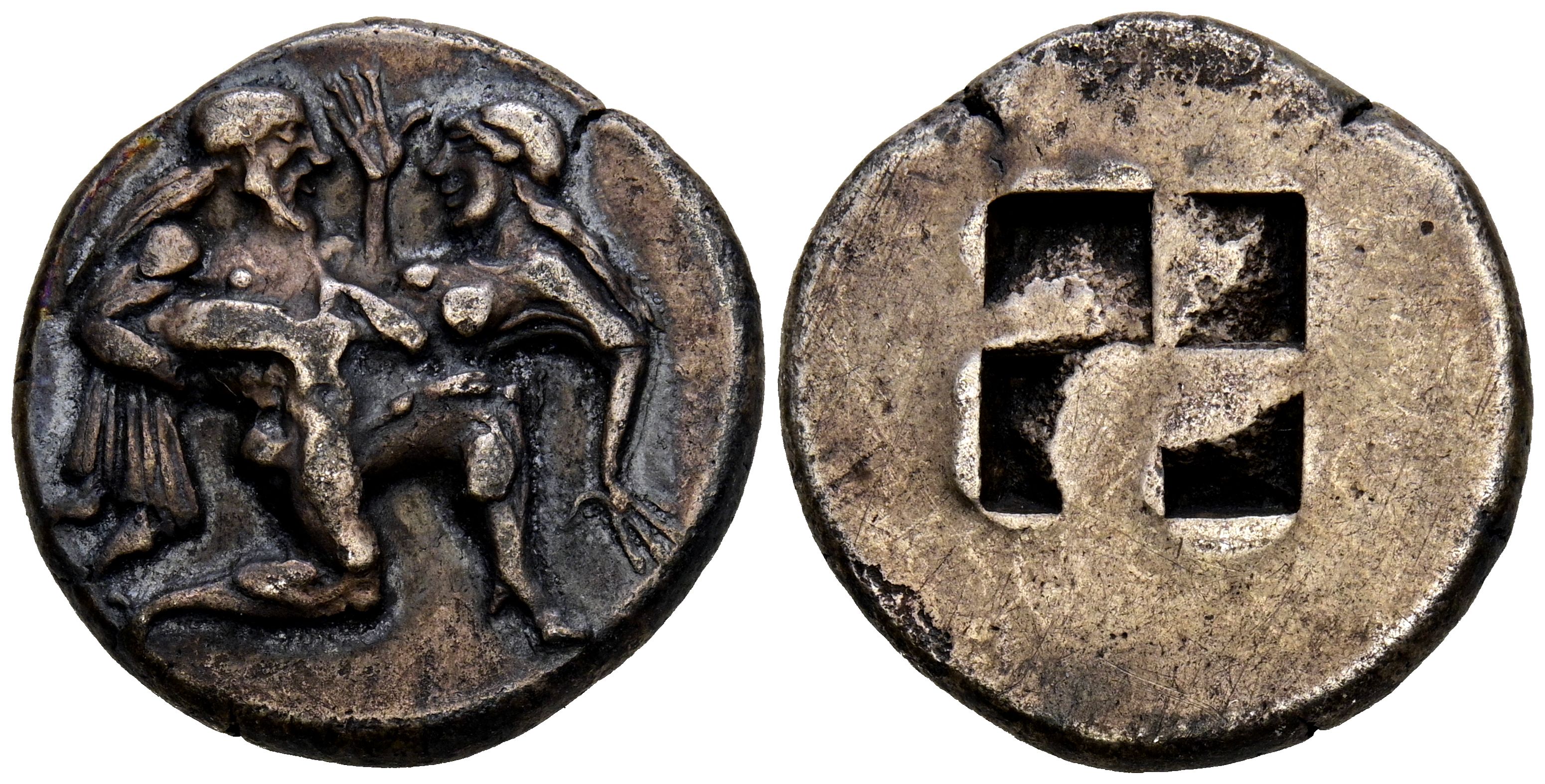 THRACE, Thasos. Stater. (Ar. 8.95g/22mm). 480-463 Fine (SNG Copenhagen 1009; HGC 6, 331). Obv: Bearded satyr advancing to the right on his knees, holding a nymph in his arm with his hands raised. Rev: Quadripartite incuse. VF+. Slightly iridescent patina. A beautiful but rare specimen.