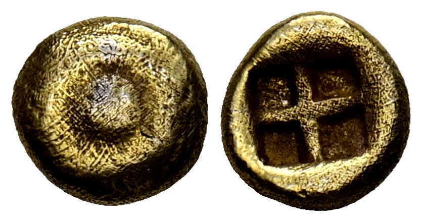 ASIA MINOR, Uncertain. 1/48 stater. (Au. 0.25g/5mm). 625-600 Fine (Rosen 366 var). Obv: Clockwise relief swastika pattern. Rev: Quadripartite incuse quadrate. VF+. Rare.