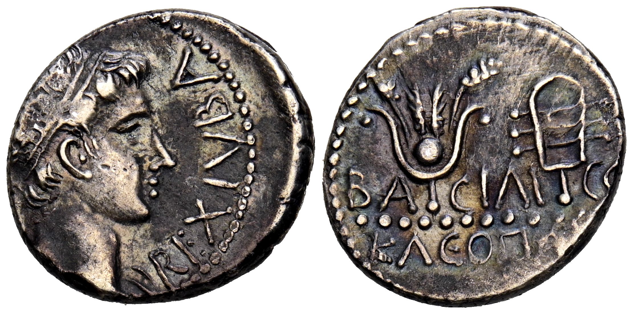 KINGS OF MAURETANIA. Juba II with Cleopatra Selene. Denarius. (Ar. 3.18g/16mm). 11-23 AD Caesarea. (SNG Copenhagen 570; MAA 99). Obv: Diademed head facing right, surrounding legend: REX IVBA. Rev: Headdress of Isis with grains of wheat, sistrum on the right, below legend: BA-CIΛIC-CA / KΛEOΠATPA. VF+.