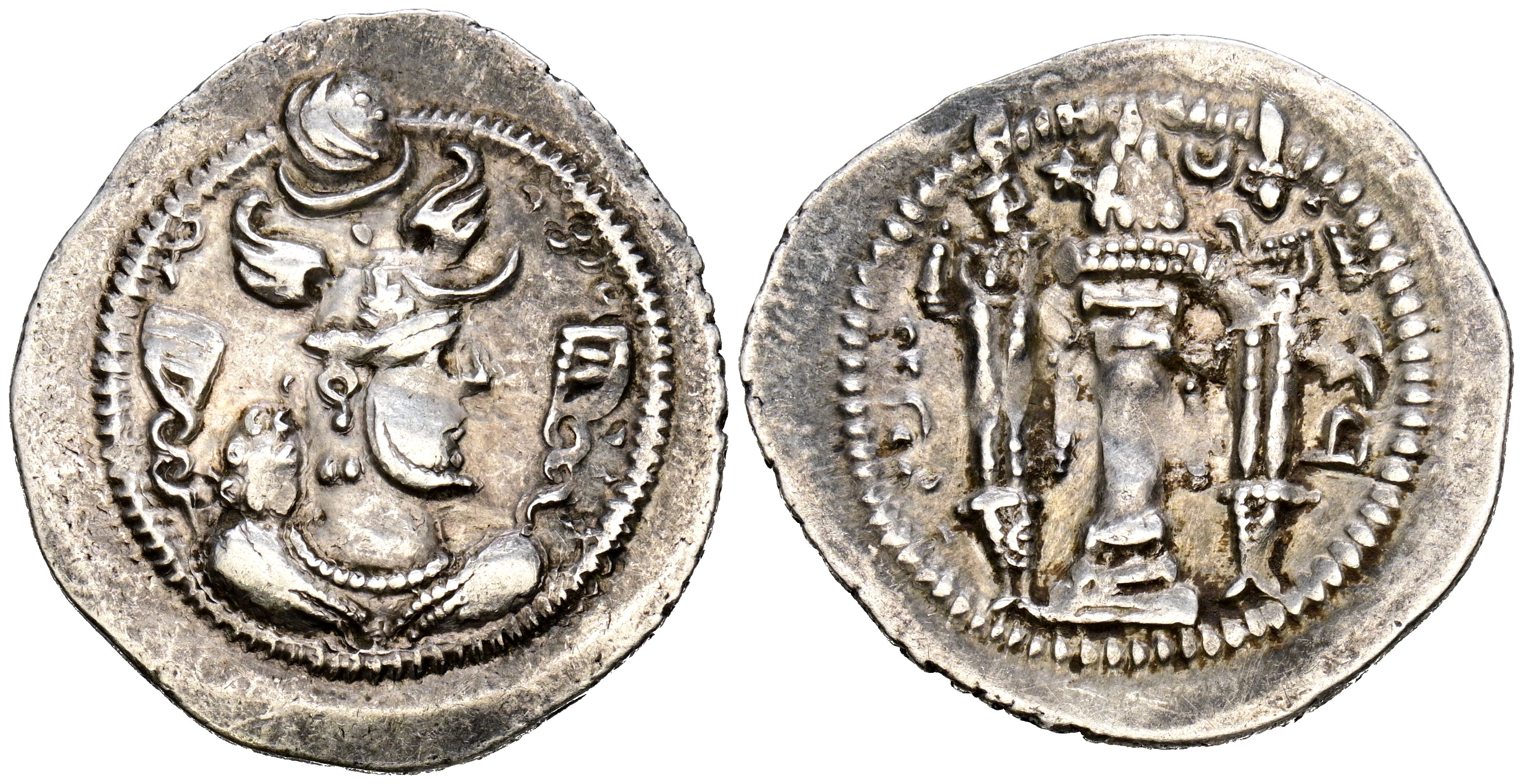 SASANID EMPIRE, Peroz I (457-484 AD) Drachma. (Ar. 4.13g/28mm). 3rd type, minted around 477-484 AD ST (Istakhr). (SNS type IIIb/1c). Obv: Crowned and draped bust of Peroz I facing right, with winged crown (type 3), frontal crescent and a korimbos set in a crescent above, around Pahlavi legend: ''kay Peroz šahan ša'' (King Peroz, King of kings). Rev: Ribboned fire altar flanked by two priests, on the right mint mark: TS (Istakhr), on the left year of minting. VF+.