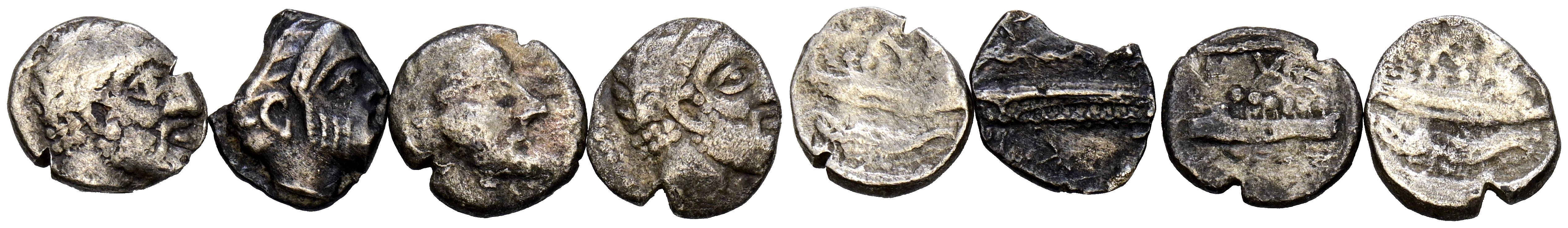ARADOS-SYRIA. Interesting set consisting of four obols. 400-384 Fine (Betlyon 13). Obverse: Laureate head of Ba'al-arwad facing right. Reverse: Galley on waves facing right, above in Aramaic M A. Varying weights and states of preservation. FOR EXAMINATION