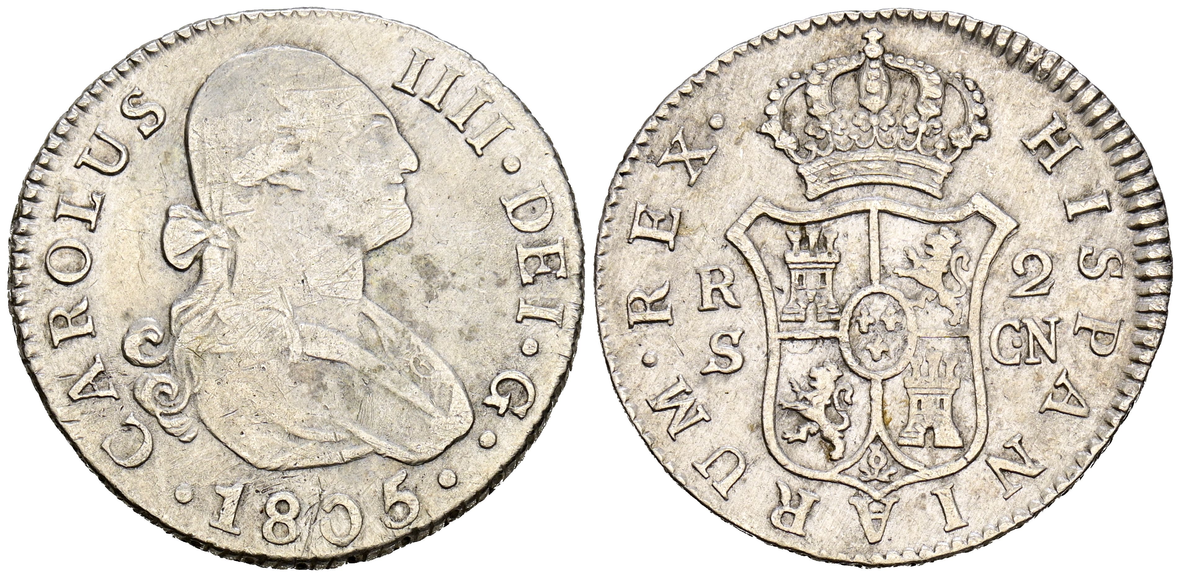 CHARLES IV (1788-1808). 2 Reales. (Ar. 5.89g/27mm). 1805. Seville CN. (Cal-2019-725). Very Fine-.