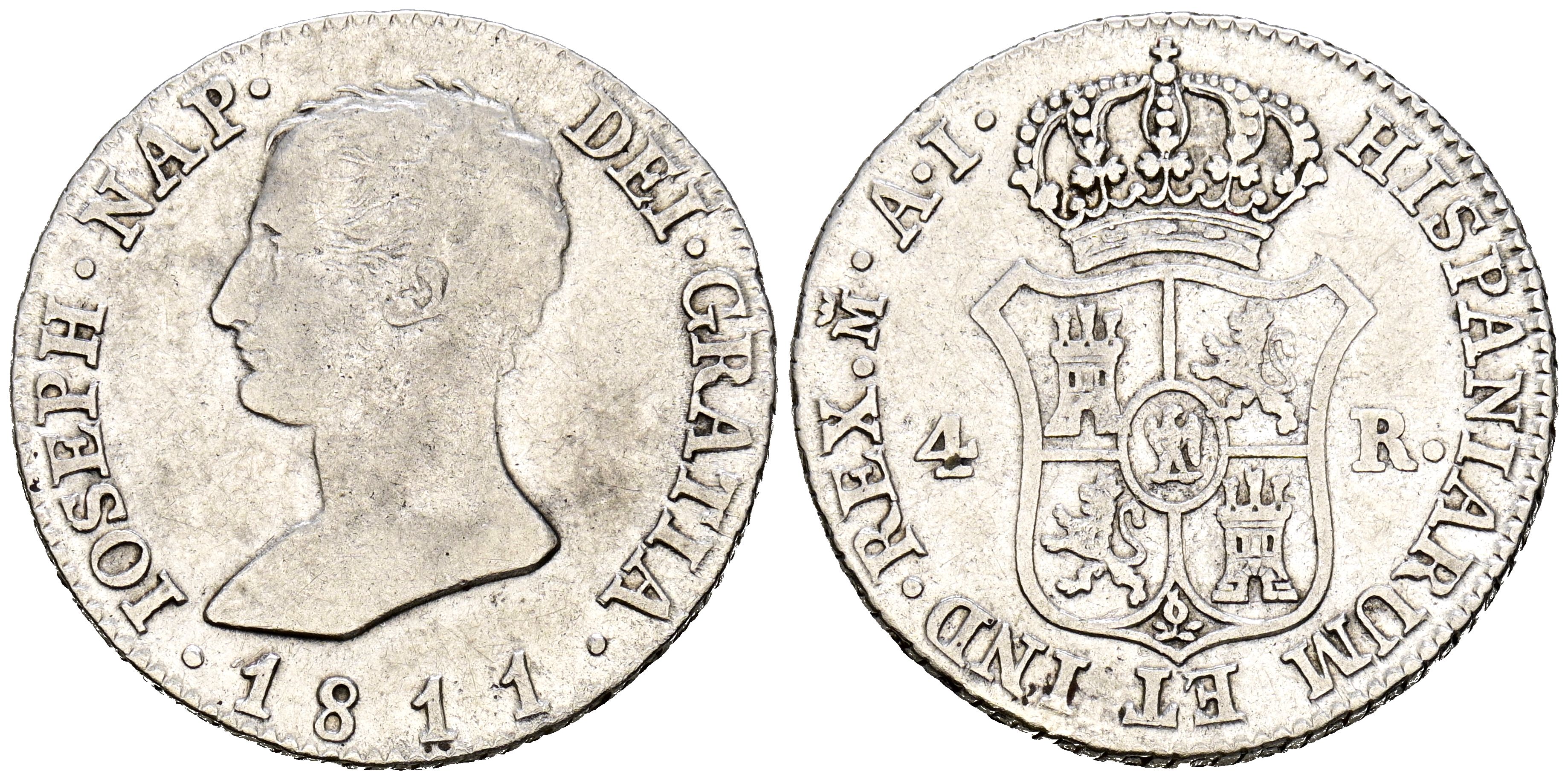 English JOSEPH NAPOLEON (1808-1813). 4 Reales. (Ar. 5.63g/26mm). 1811. Madrid AI. (Cal.-2019-15). VF+. Traces of original luster.
