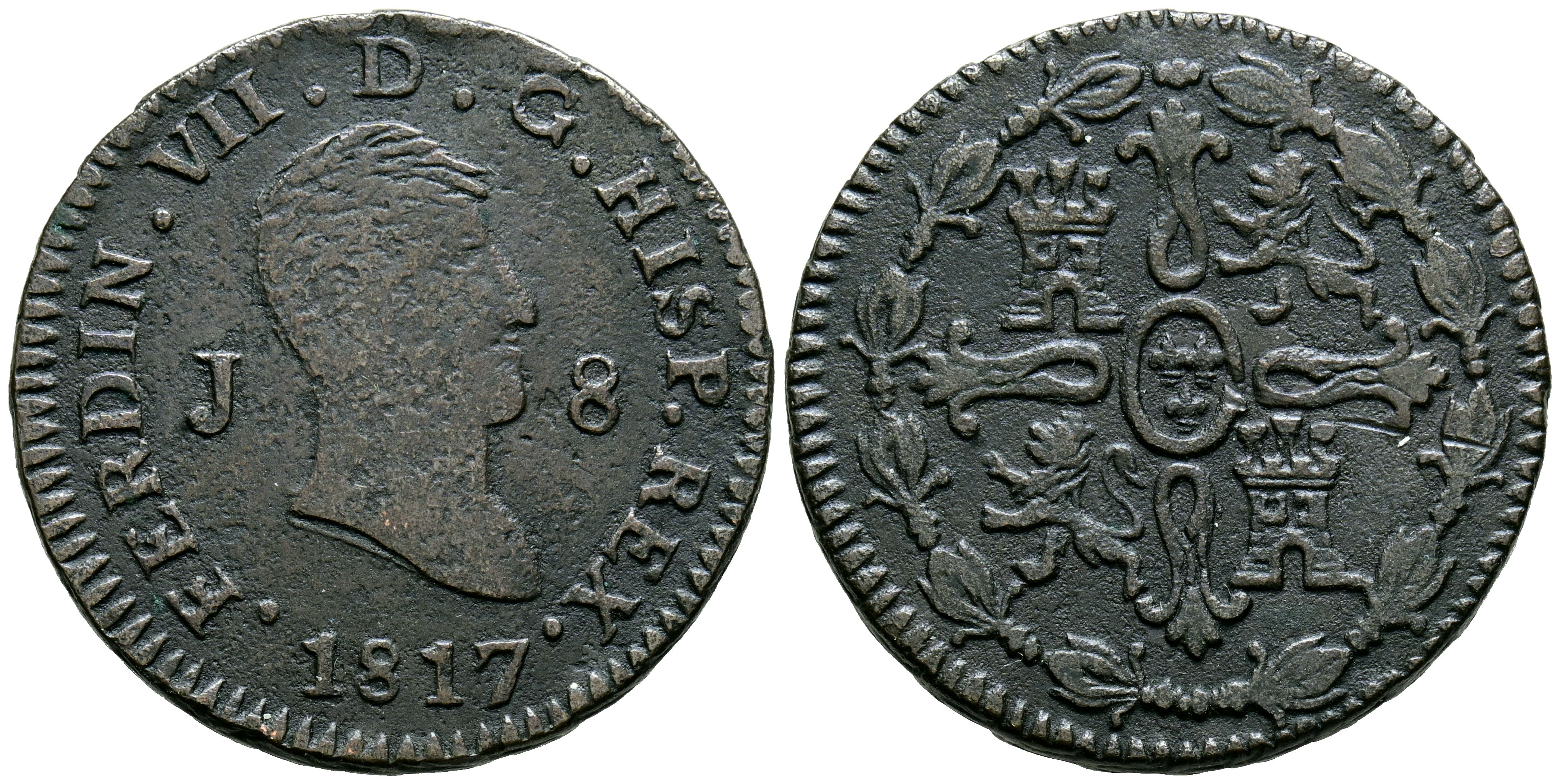 English FERDINAND VII (1808-1833). 8 Maravedis. (Ae. 10.22g/29mm). 1817. Jubia. (Cal-2019-196). Naked bust. Very Fine.