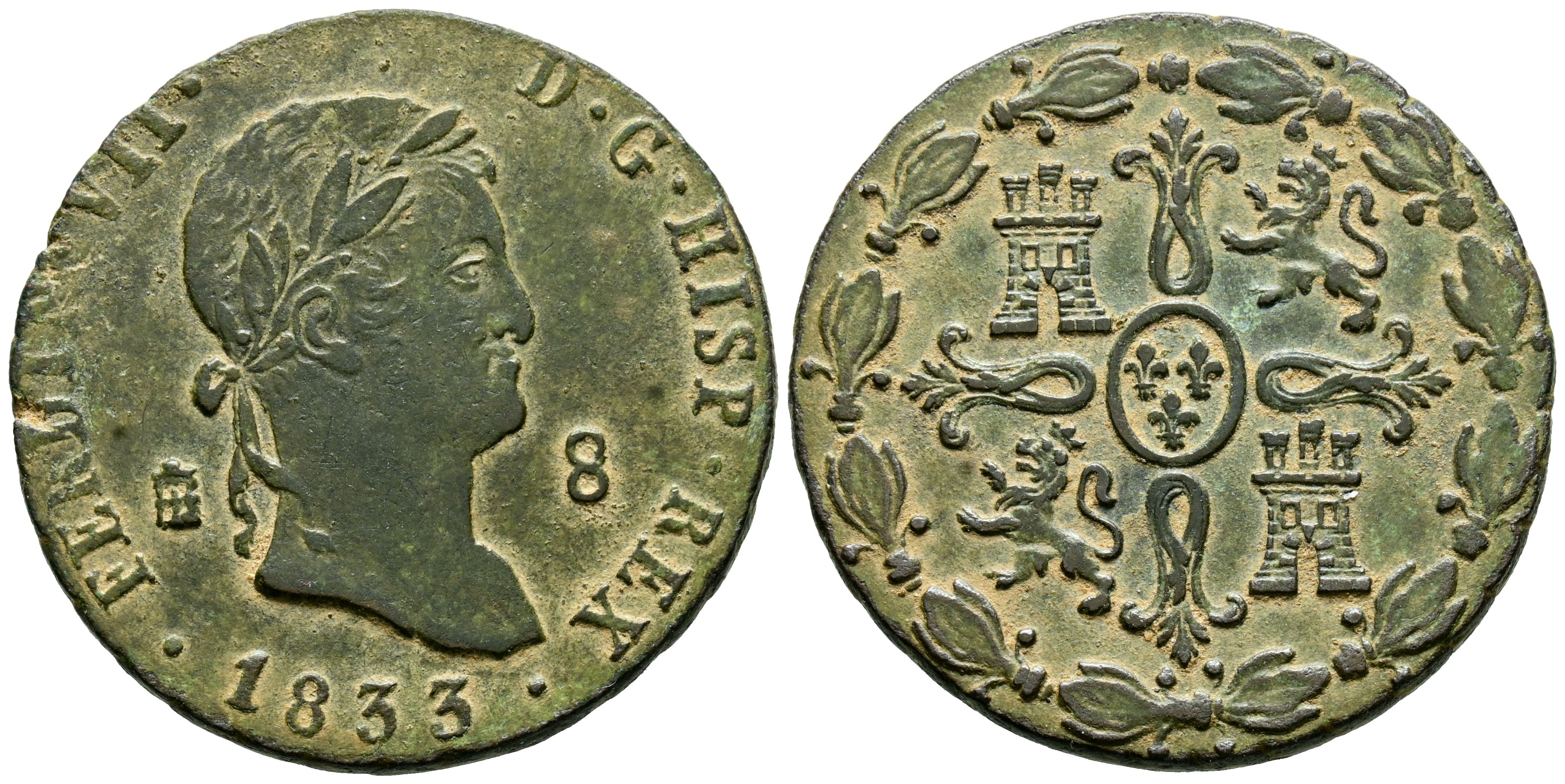 FERDINAND VII (1808-1833). 8 Maravedis. (Ae. 10.07g/29mm). 1833. Segovia. (Cal-2019-239). Good Very Fine.