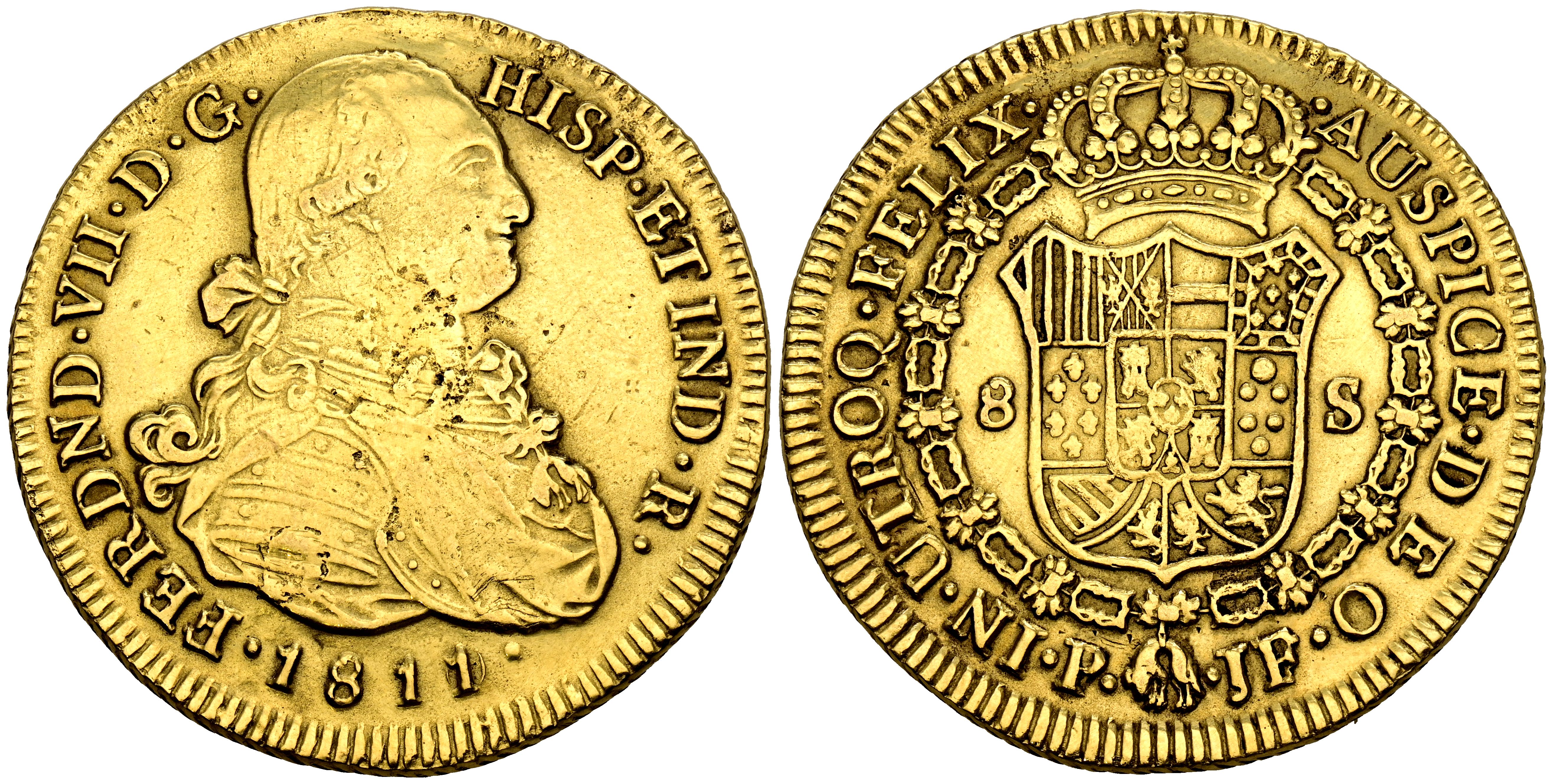FERDINAND VII (1808-1833). 8 Shields. (Au. 27.10g/37mm). 1811/0. Popayan JF. Jewelry copy. Very Fine. Gold of 0.800 thousandths.