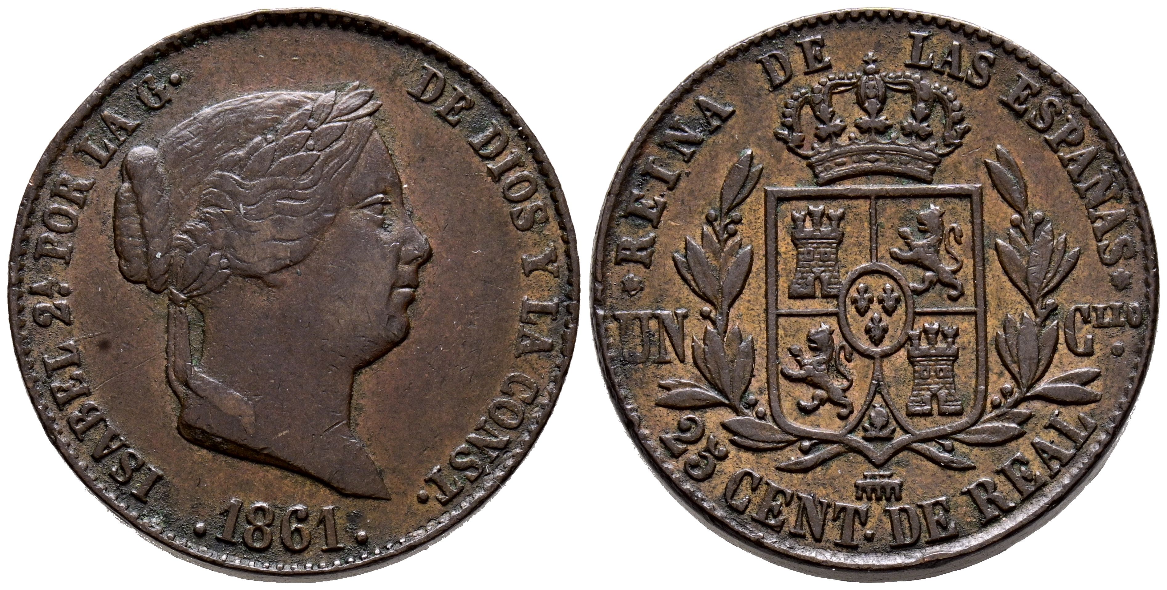 ELIZABETH II (1833-1868). 25 Real Cents. (Ae. 9.42g/27mm). 1861. Segovia. (Cal-2019-194). Good Very Fine.