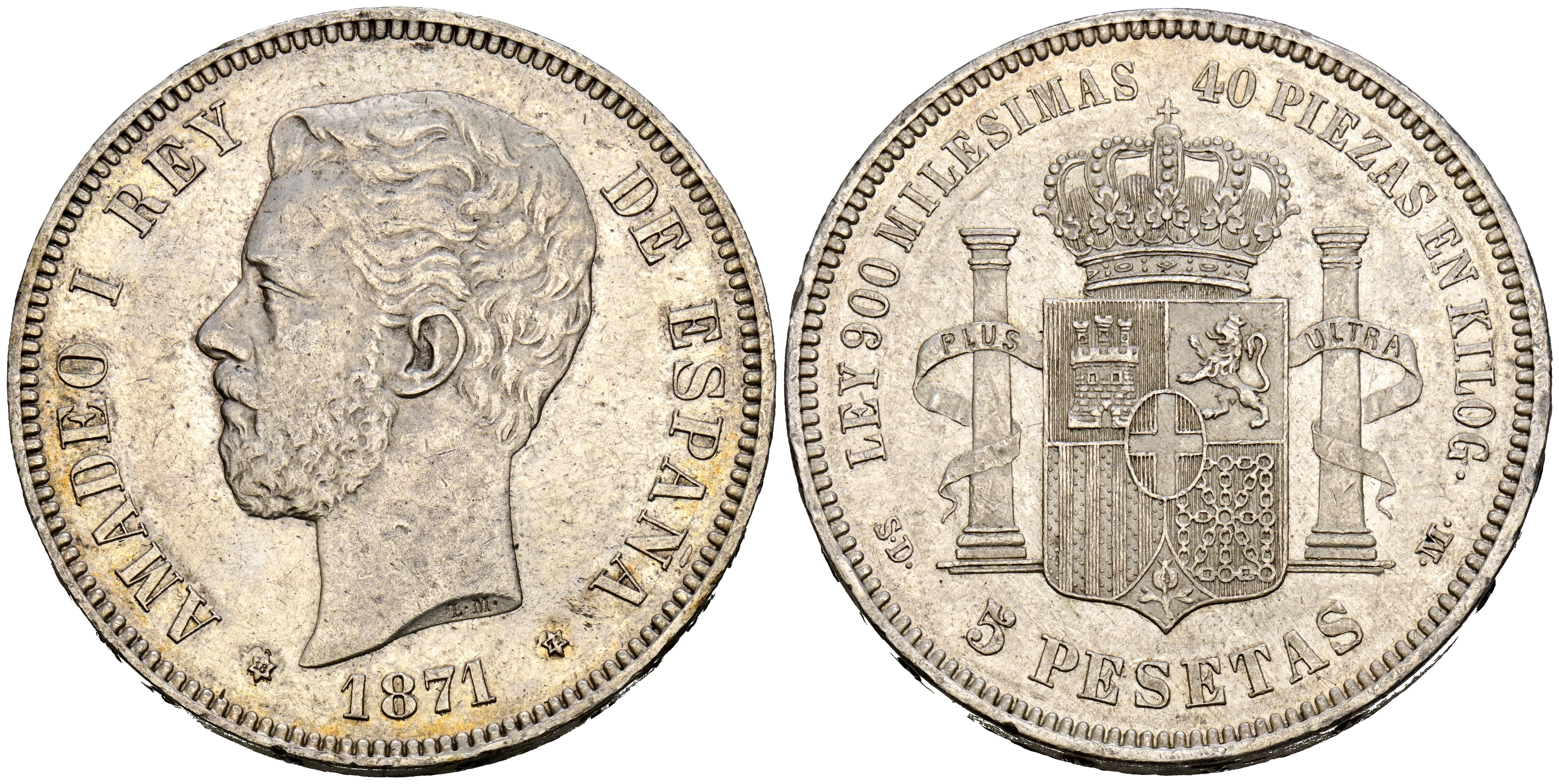 English AMADEO I (1871-1873). 5 Pesetas. (Ar. 25.10g/37mm). 1871 *18-71. Madrid SDM. (Cal-2019-1). Good Very Fine.