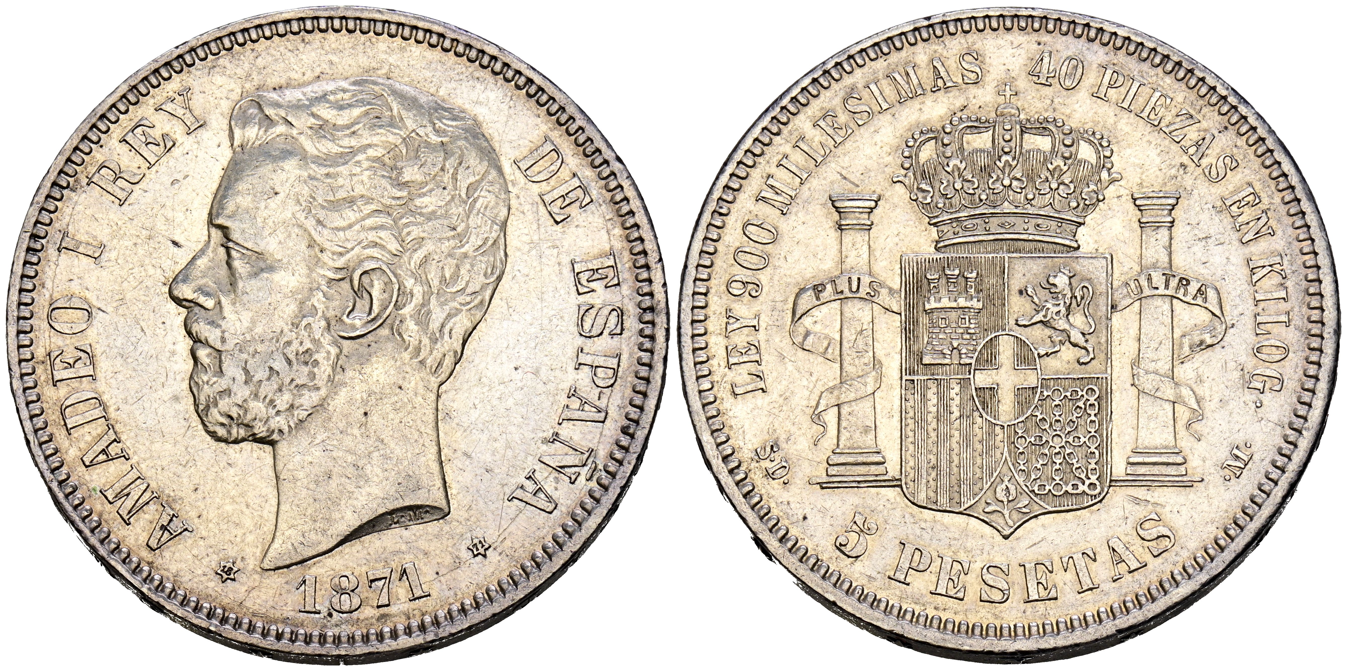 AMADEO I (1871-1873). 5 Pesetas. (Ar. 24.79g/37mm). 1871 *18-71. Madrid SDM. (Cal. 2019-1). VF+. Traces of original luster.