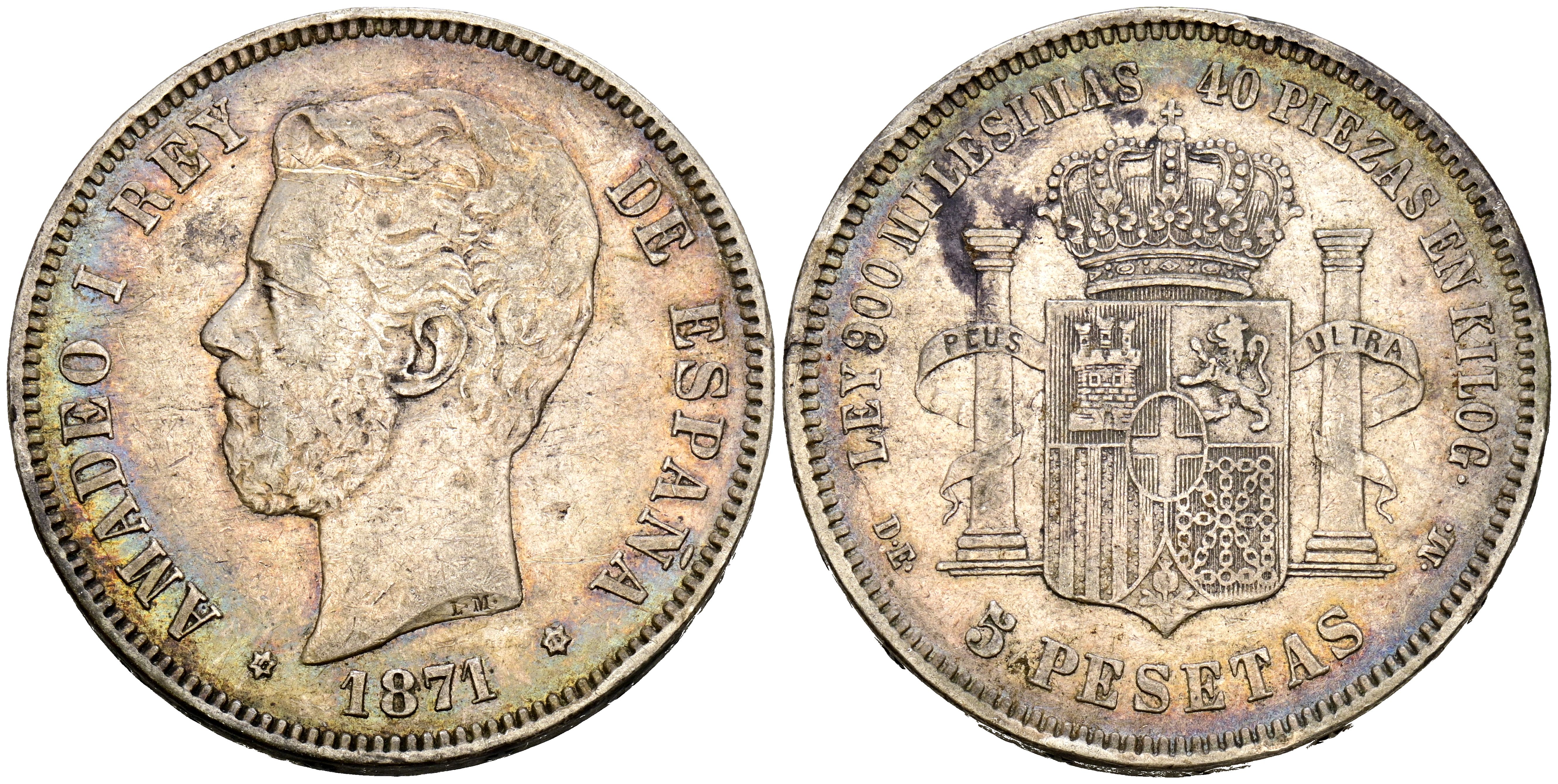 AMADEO I (1871-1873). 5 Pesetas. (Ar. 24.85g/37mm). 1871 *18-75. Madrid DEM. (Cal-2019-7). Struck during the reign of Alfonso XII. VF-. Beautiful patina.