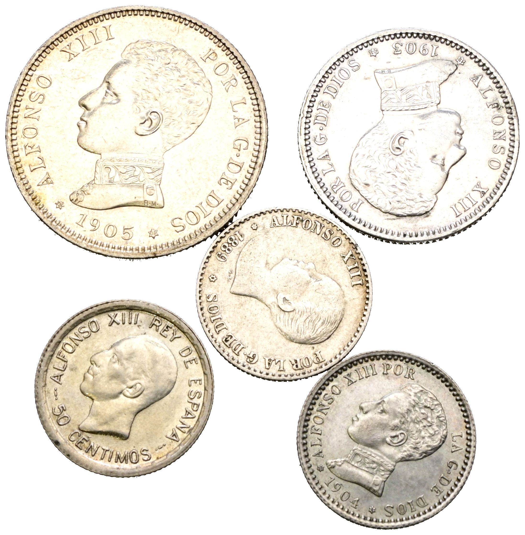 Alfonso XII (1874-1885). Set of 5 coins, no repetitions, with modules of 50 Cents (3), 1 Peseta (1) and 2 Pesetas (1). High degree of overall preservation. TO BE EXAMINED.
