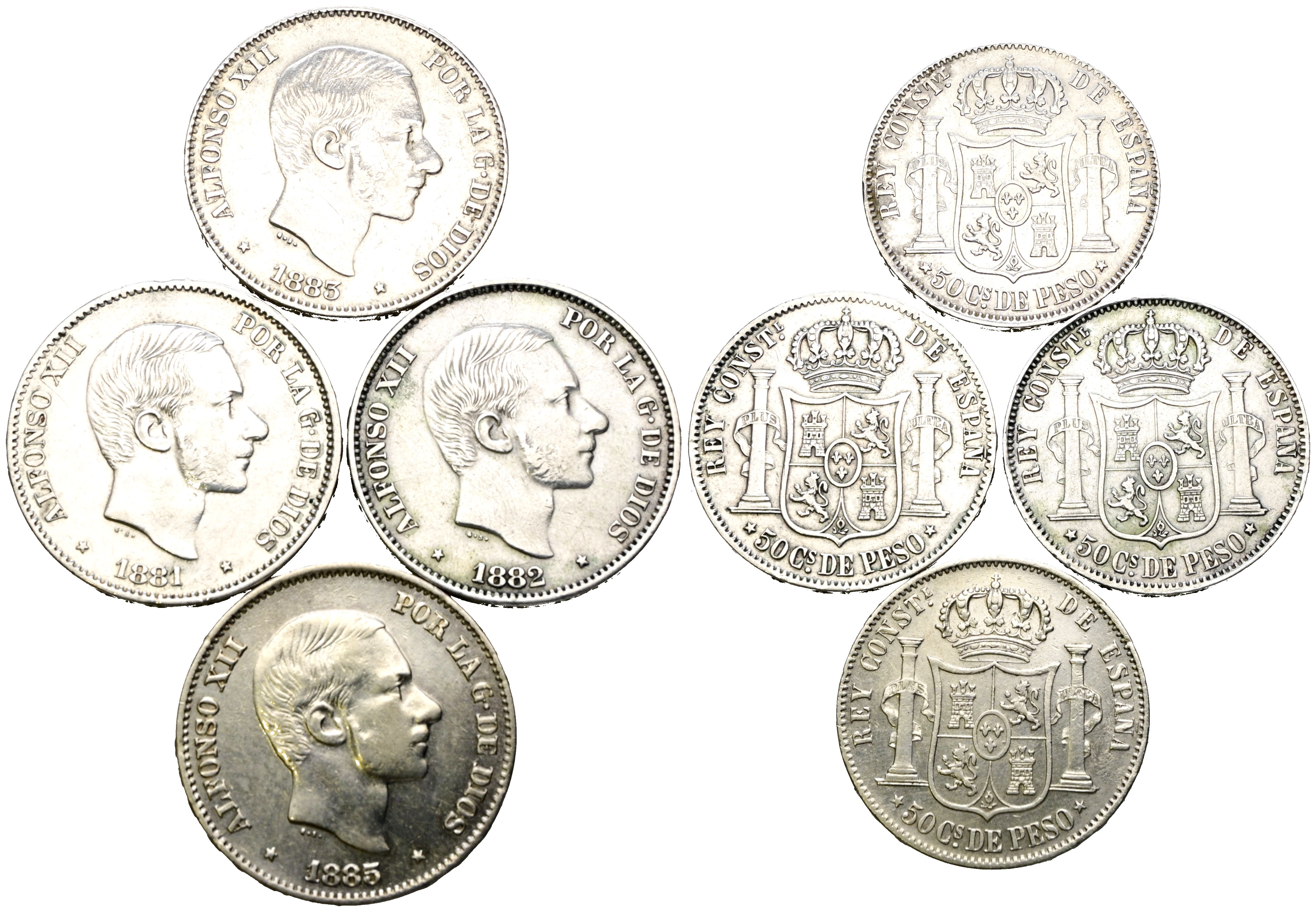 ALFONSO XII (1874-1885). Set of four 50-centavo coins minted in Manila in 1881, 1882, 1883, and 1885. Varying states of preservation. FOR EXAMINATION.