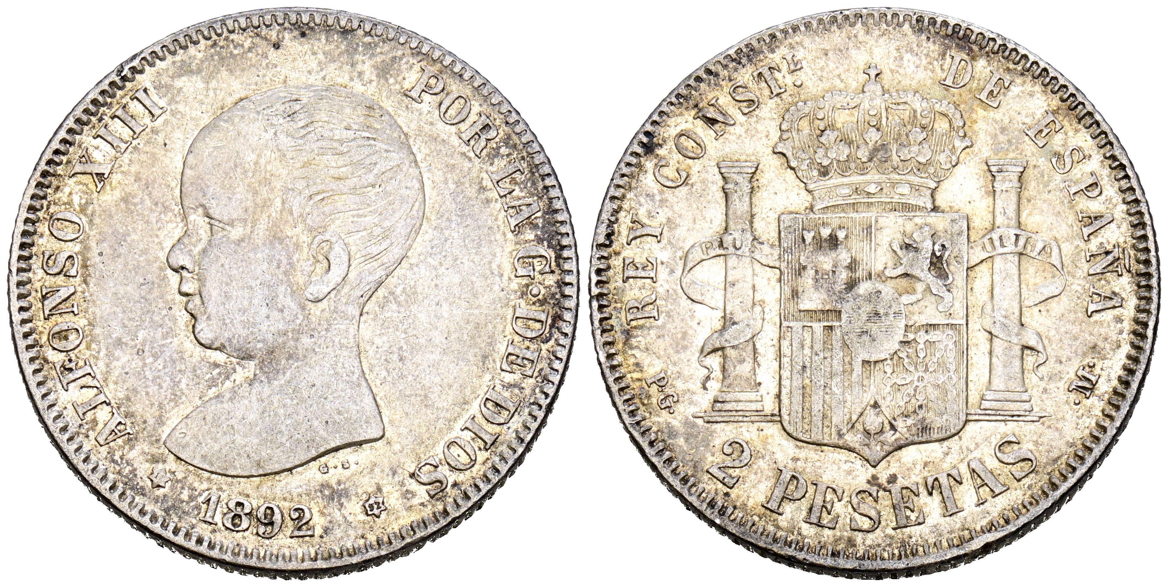 ALFONSO XIII (1885-1931). 2 Pesetas. (Ar. 9.98g/27mm). 1892 *18-82. Madrid PG-M. (Cal-2019-85). Good Very Fine. Nice tone.