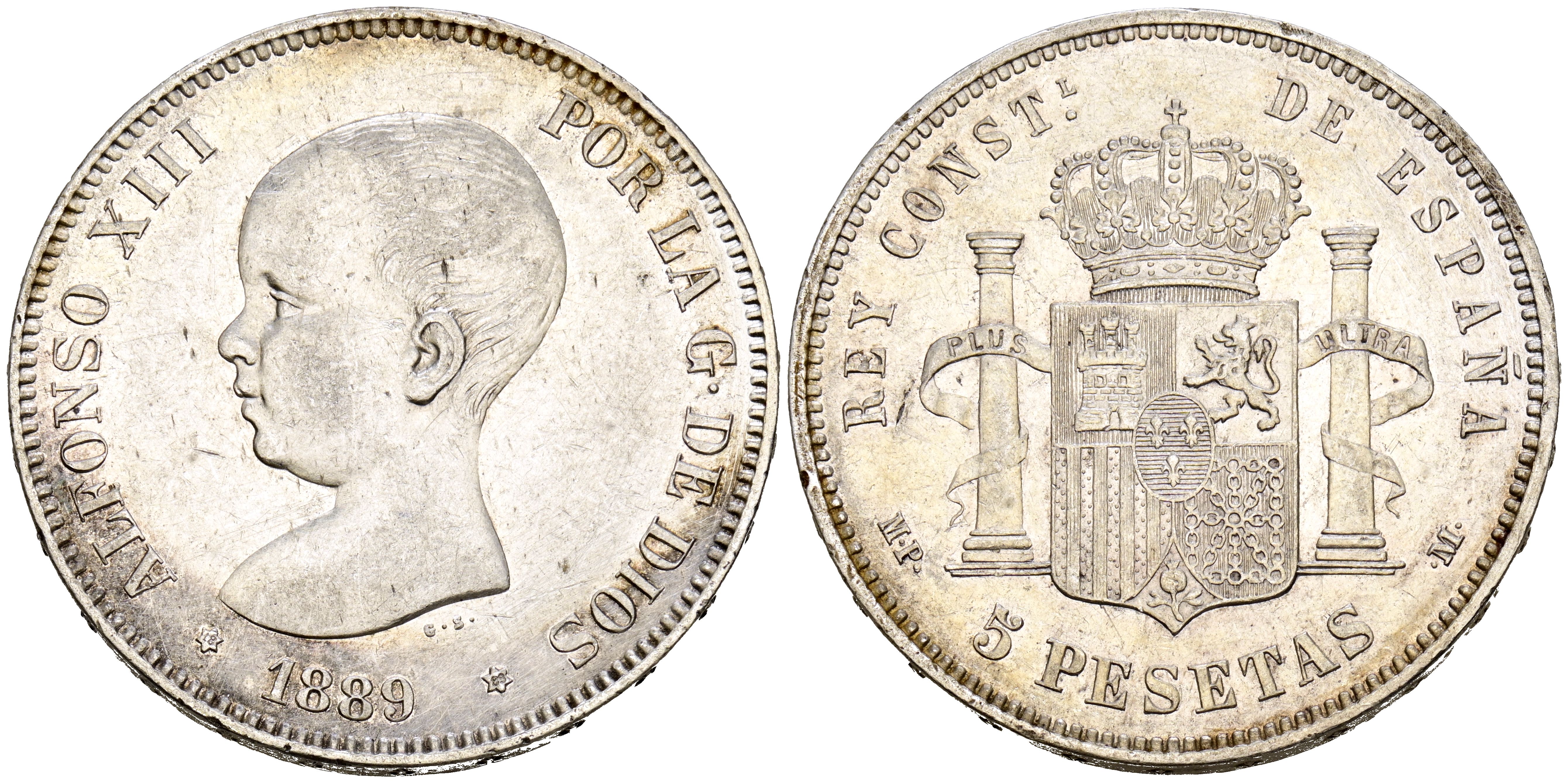 Alfonso XIII (1885-1931). 5 Pesetas. (Ar. 24.86g/37mm). 1889 *18-89. Madrid MPM. (Cal. 2019-93). VF+. Cleaning lines.