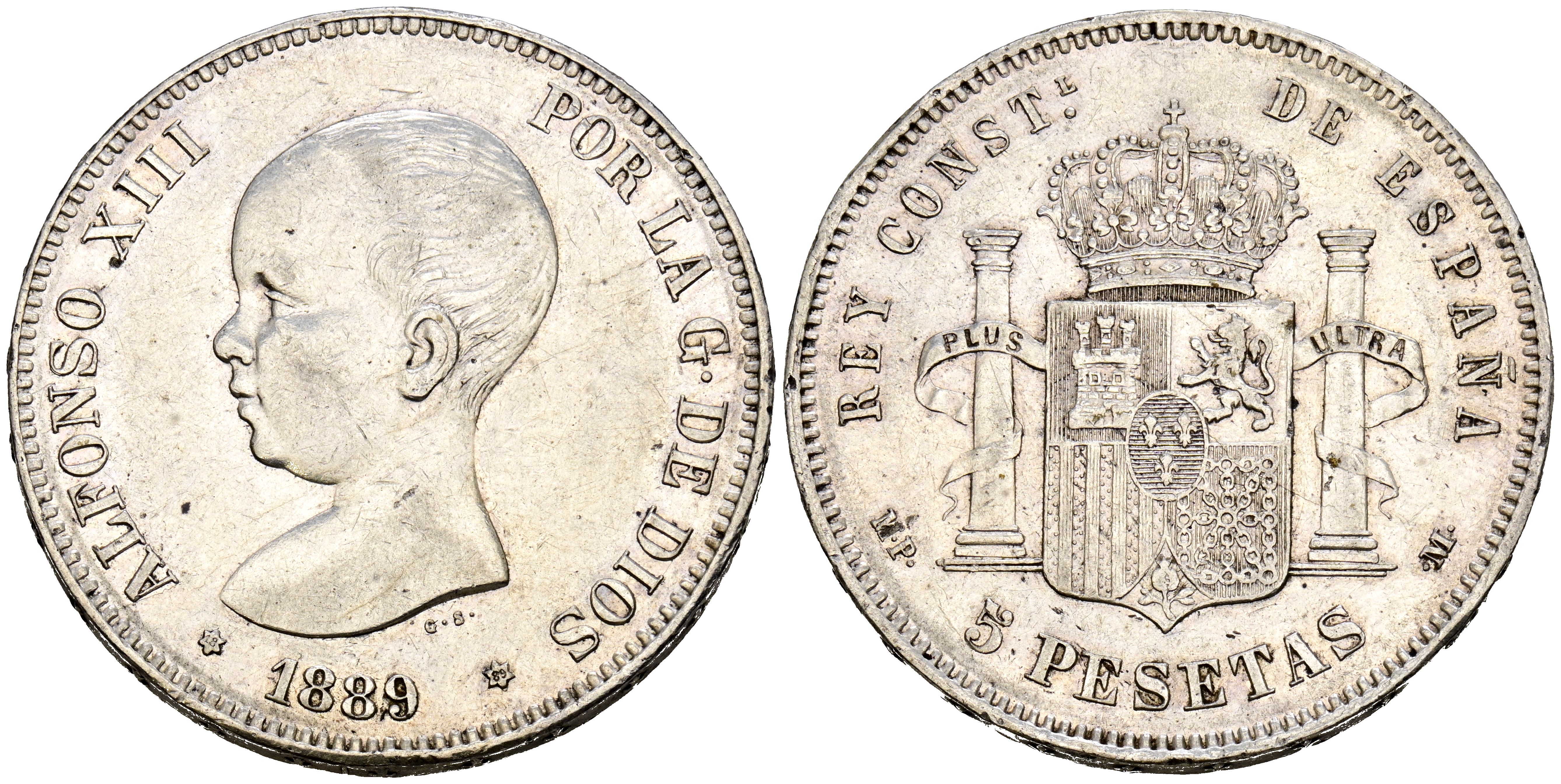 ALFONSO XIII (1885-1931). 5 Pesetas. (Ar. 24.93g/37mm). 1889 *18-89. Madrid MPM. (Cal-2019-93). Very Fine.