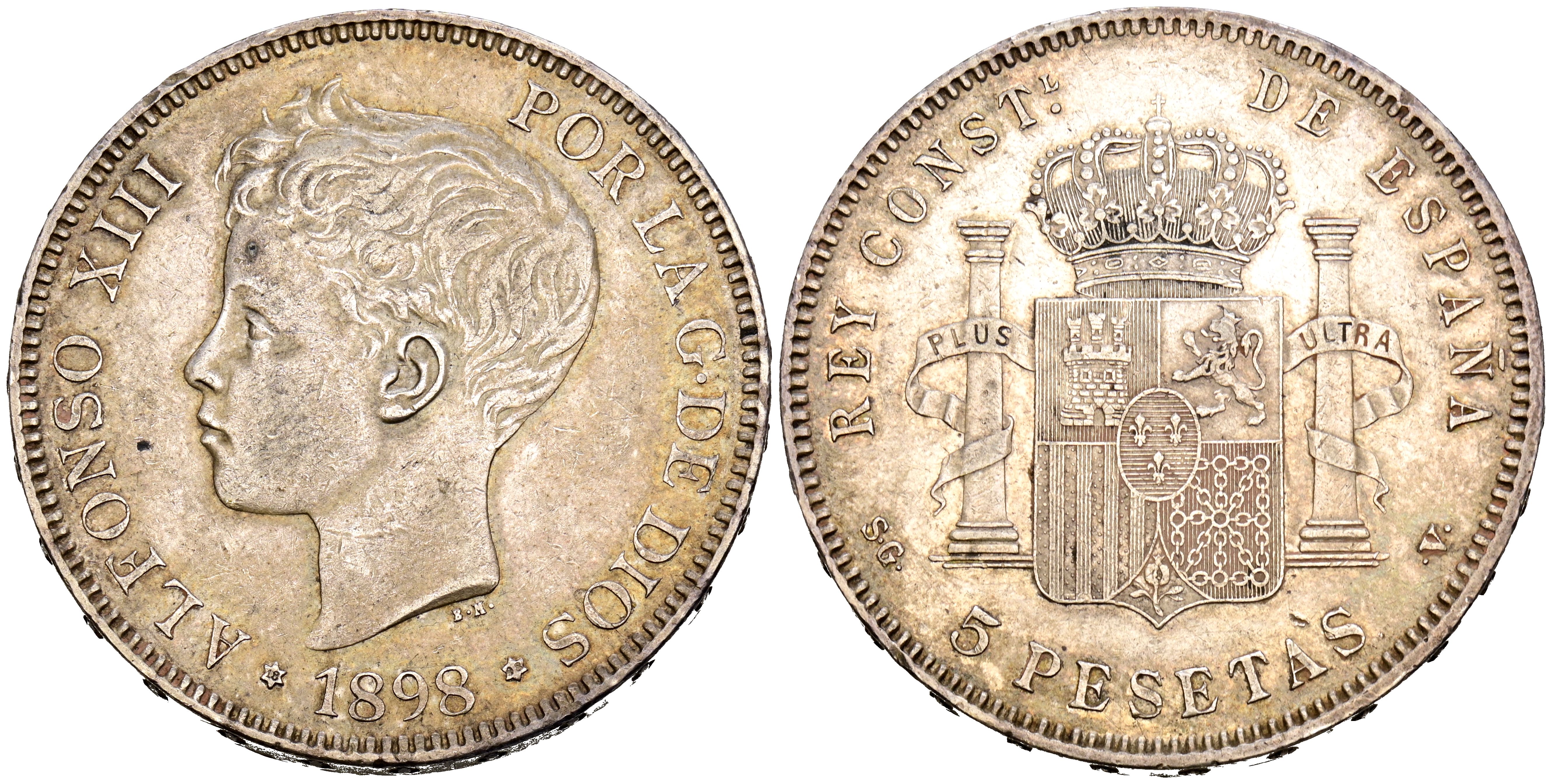 ALFONSO XIII (1885-1931). 5 Pesetas. (Ar. 24.89g/37mm). 1898 *18-98. Madrid SGV. (Cal-2019-109). Good Very Fine. Attractive golden patina.