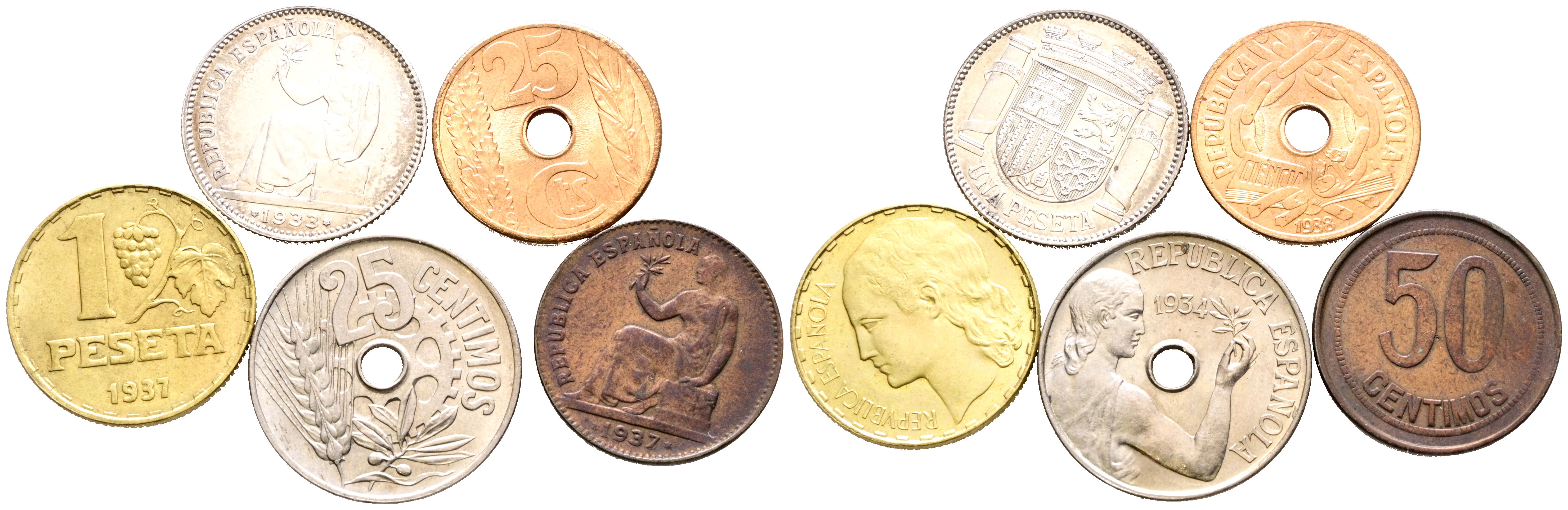 Second Republic (1931-1939). Beautiful lot of five coins of different sizes and materials, including the 1933 Peseta. All coins range in fineness from Fine+ to Finest. Worth examining.