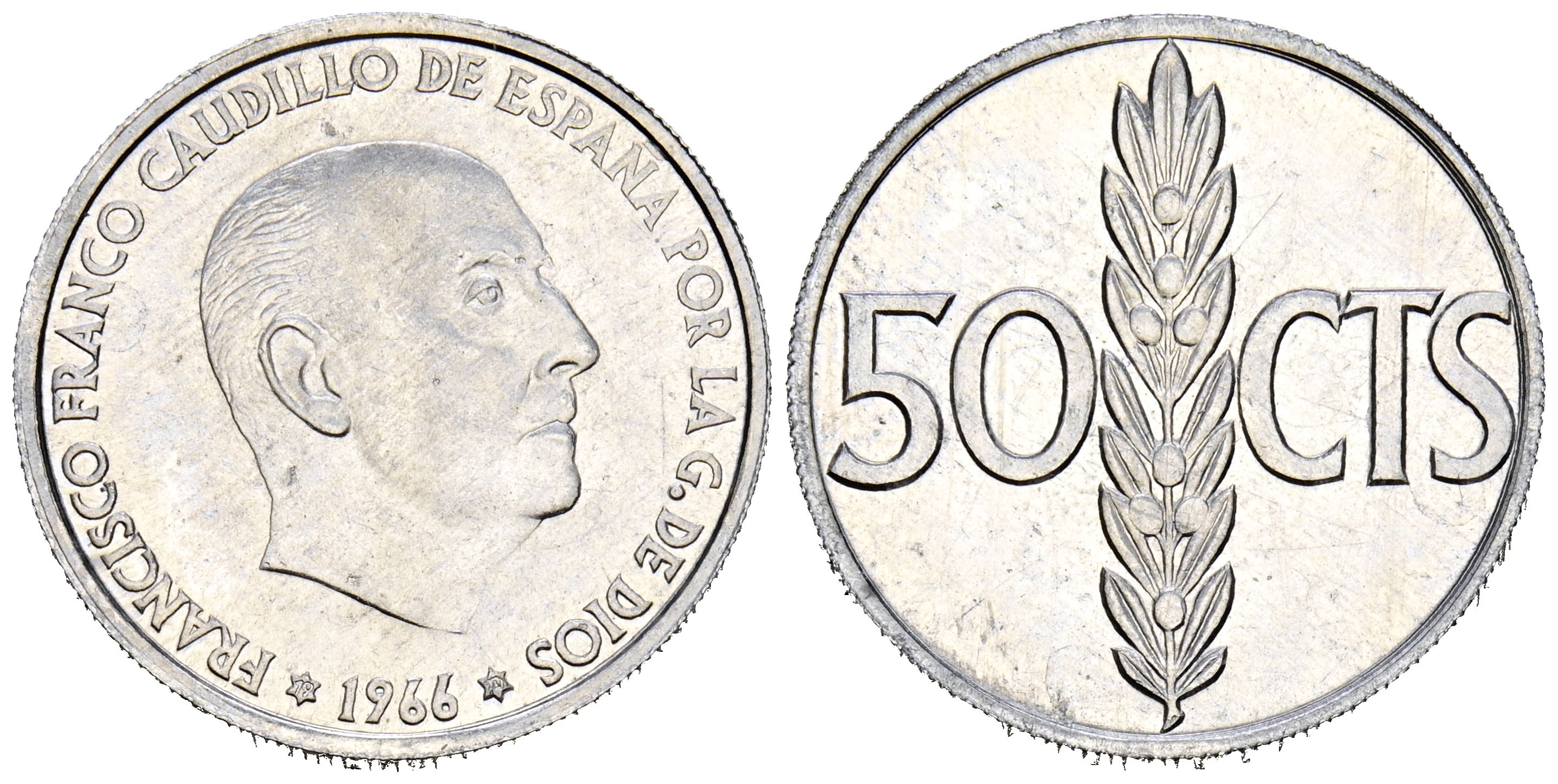 SPANISH STATE (1936-1975). 50 Cents. (H. 0.97g/20mm). 1966 *19-70. Madrid. (Cal. 2019-34). Uncirculated-. A rare example of this coin.