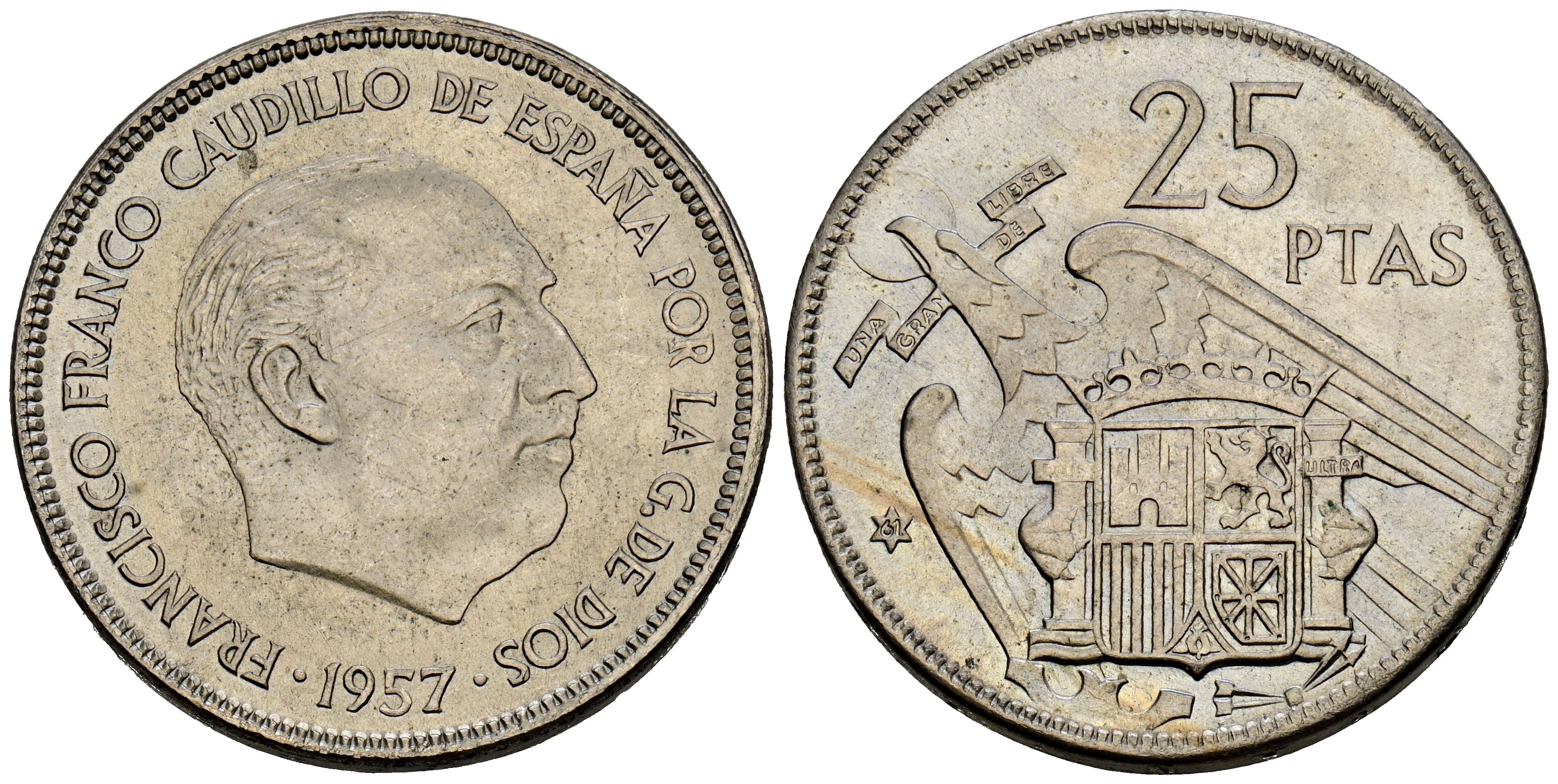 SPANISH STATE (1936-1975). 25 Pesetas. (Ni. 8.49g/27mm). 1957 *61. Madrid. (Cal-2019-118). Uncirculated. Scarce.