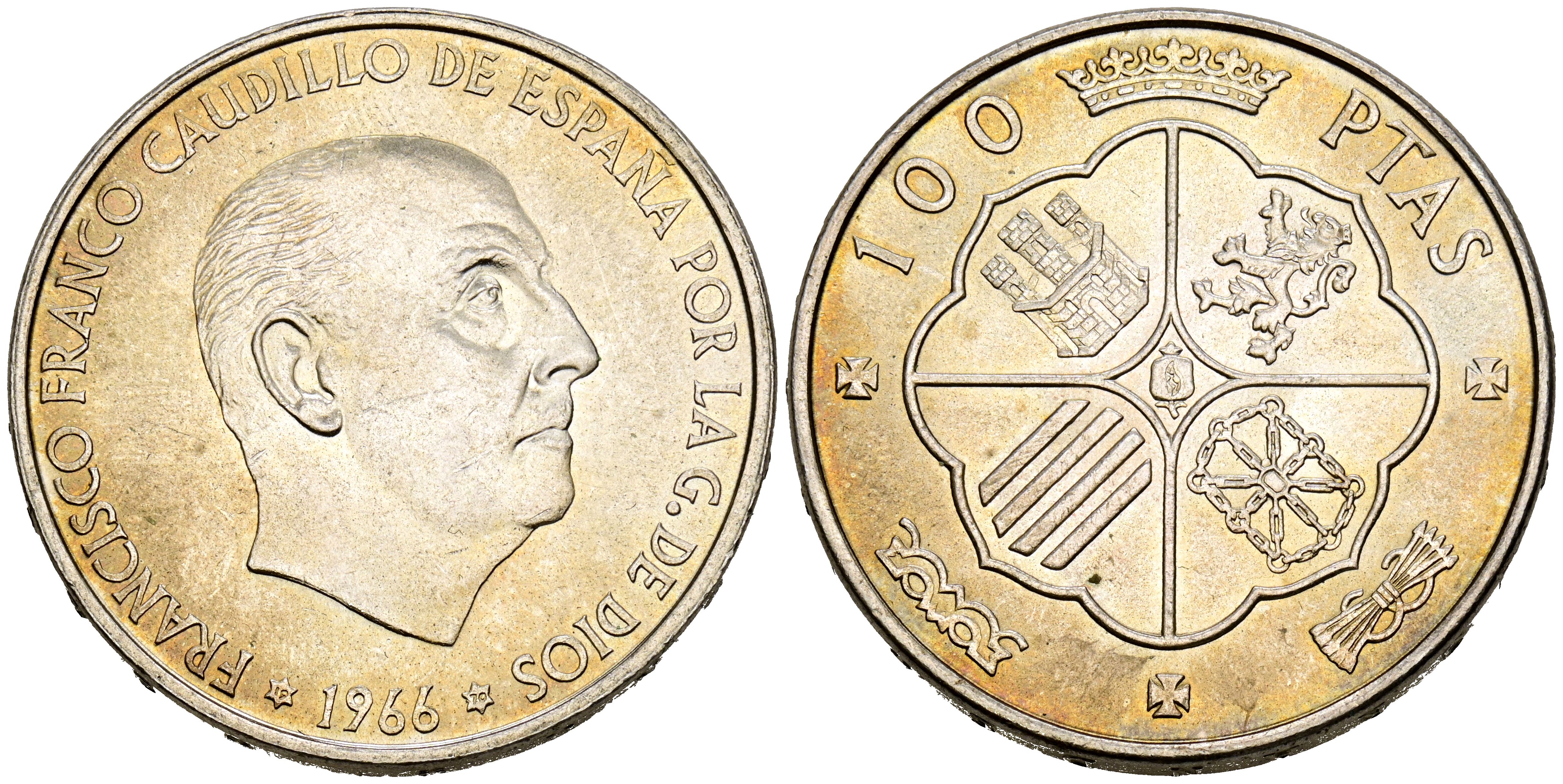 SPANISH STATE (1936-1975). 100 Pesetas (Ar. 19.02g/34mm). 1966 *19-70. Madrid. (Cal. 2019-150). Good Extremely Fine. Beautiful gold patina. Some small scratches on the obverse.