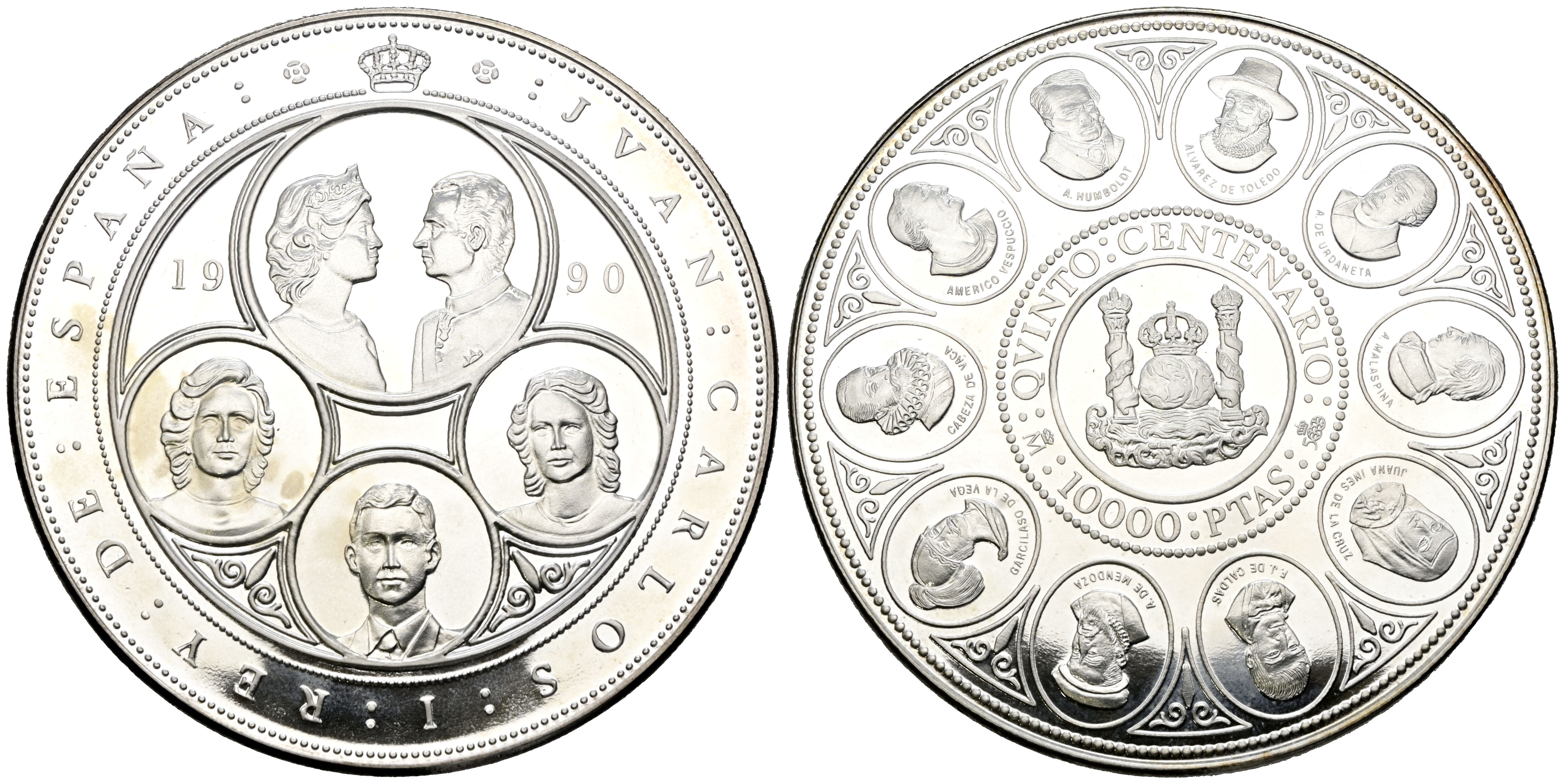 JUAN CARLOS I (1975-2014). 10,000 Pesetas. (Ar. 168.75g/73mm). 1990. FNMT. Fifth Centenary Series. Series II. FDC. Includes a coin capsule.
