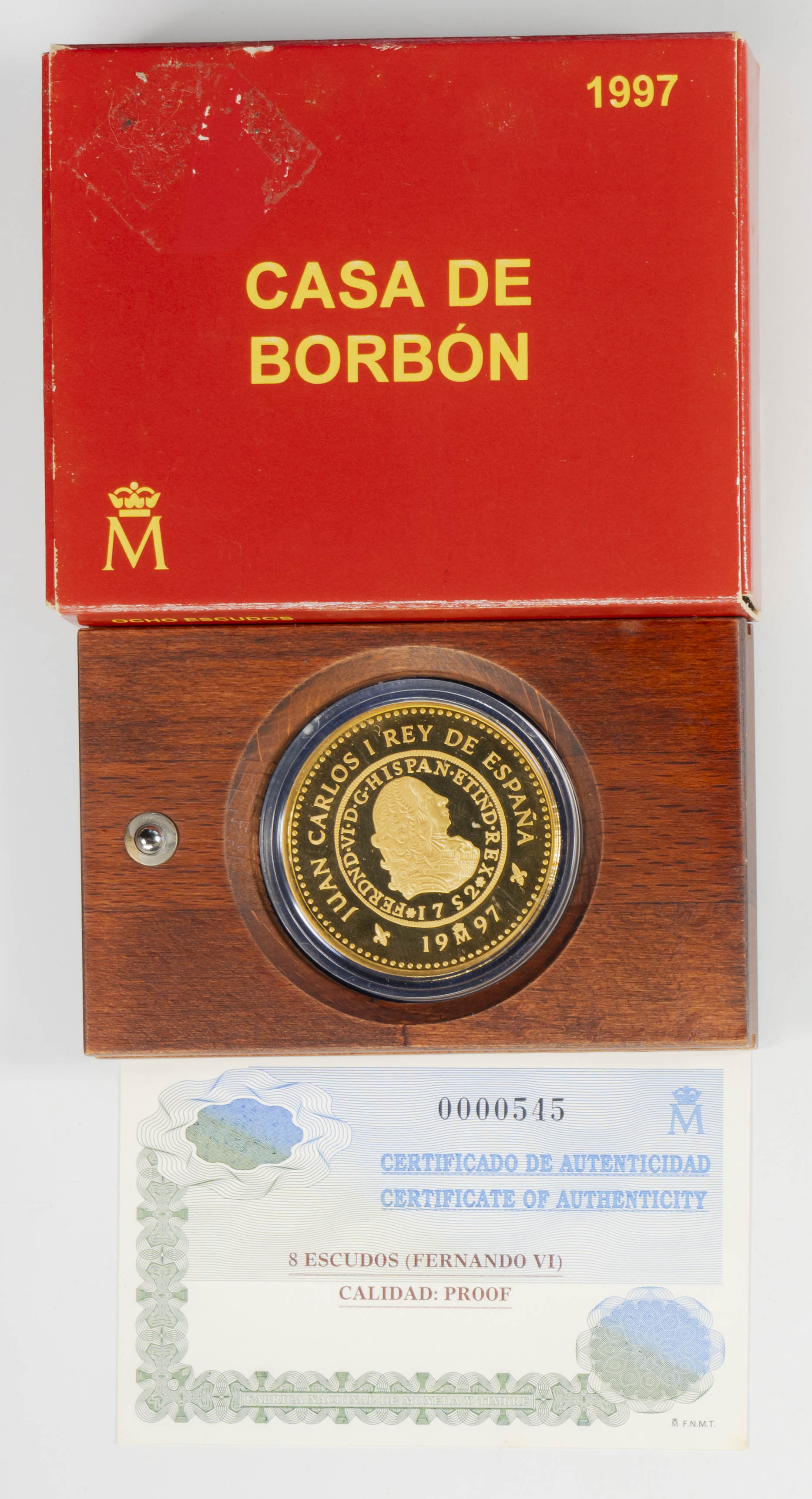 JUAN CARLOS I (1975-2014). 80,000 Pesetas. (Au. 27.00g/38mm). 1997. FNMT. House of Bourbon. Ferdinand VI. PROOF. Mintage of 3,000. Includes original case and certificate of authenticity.