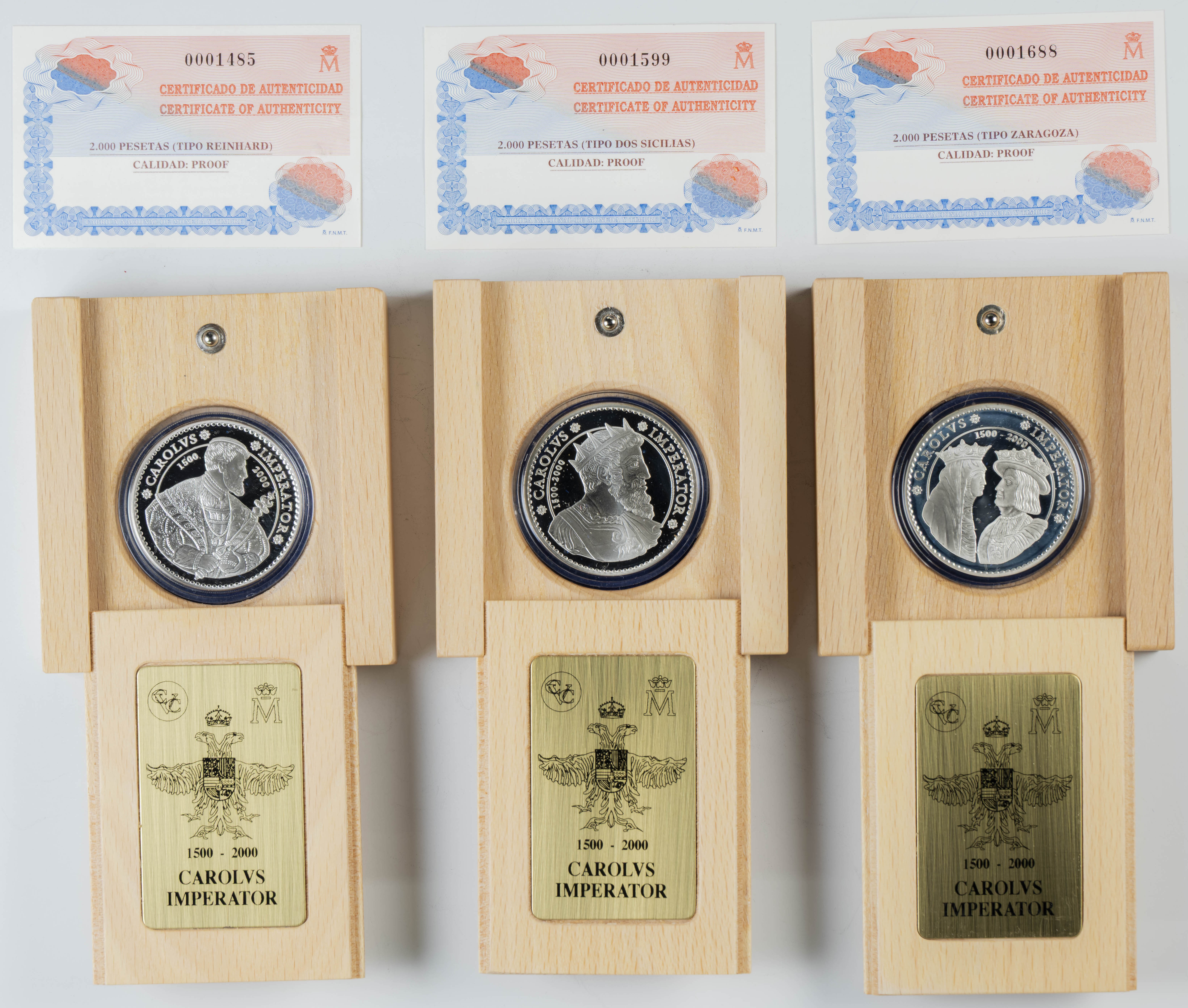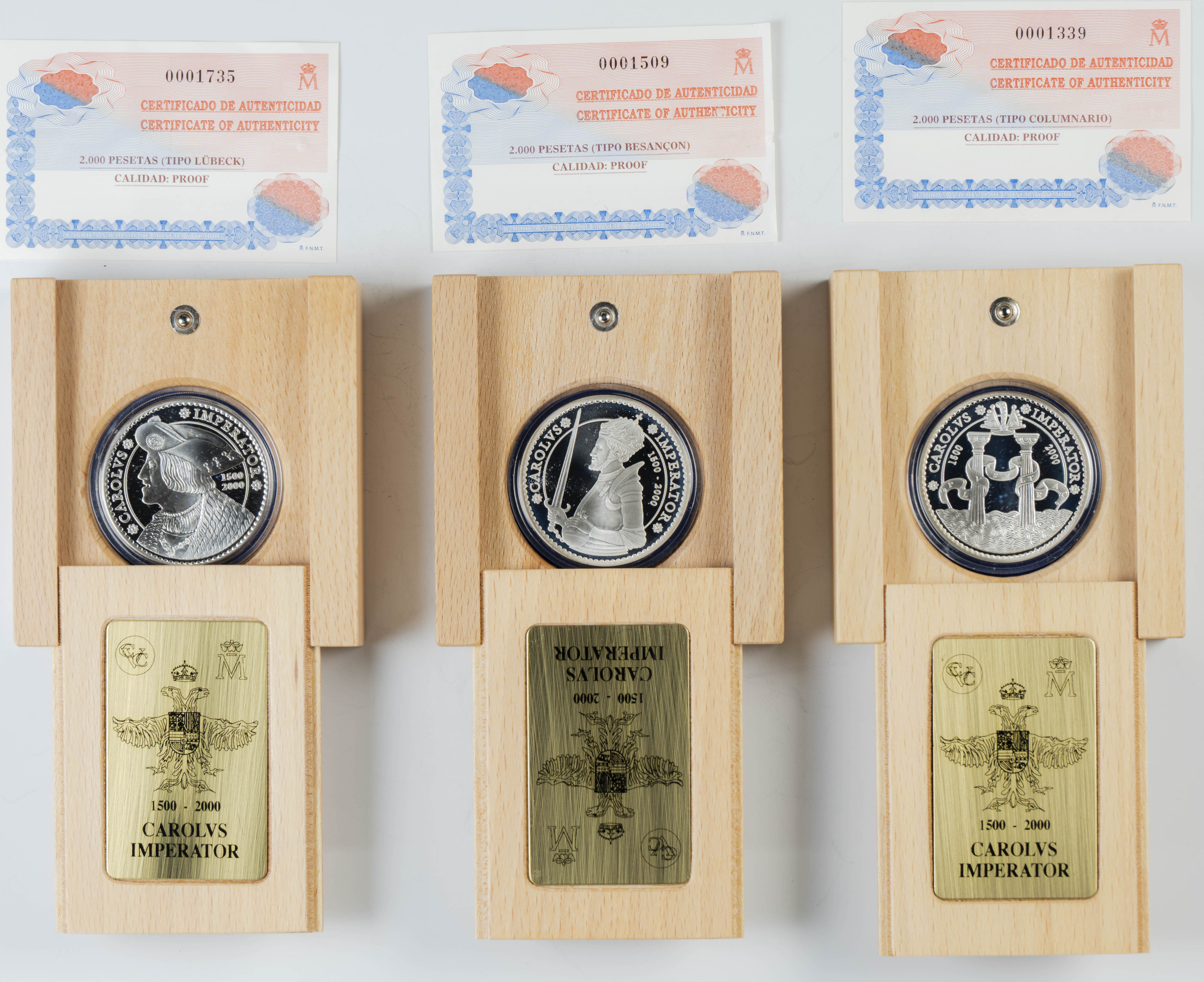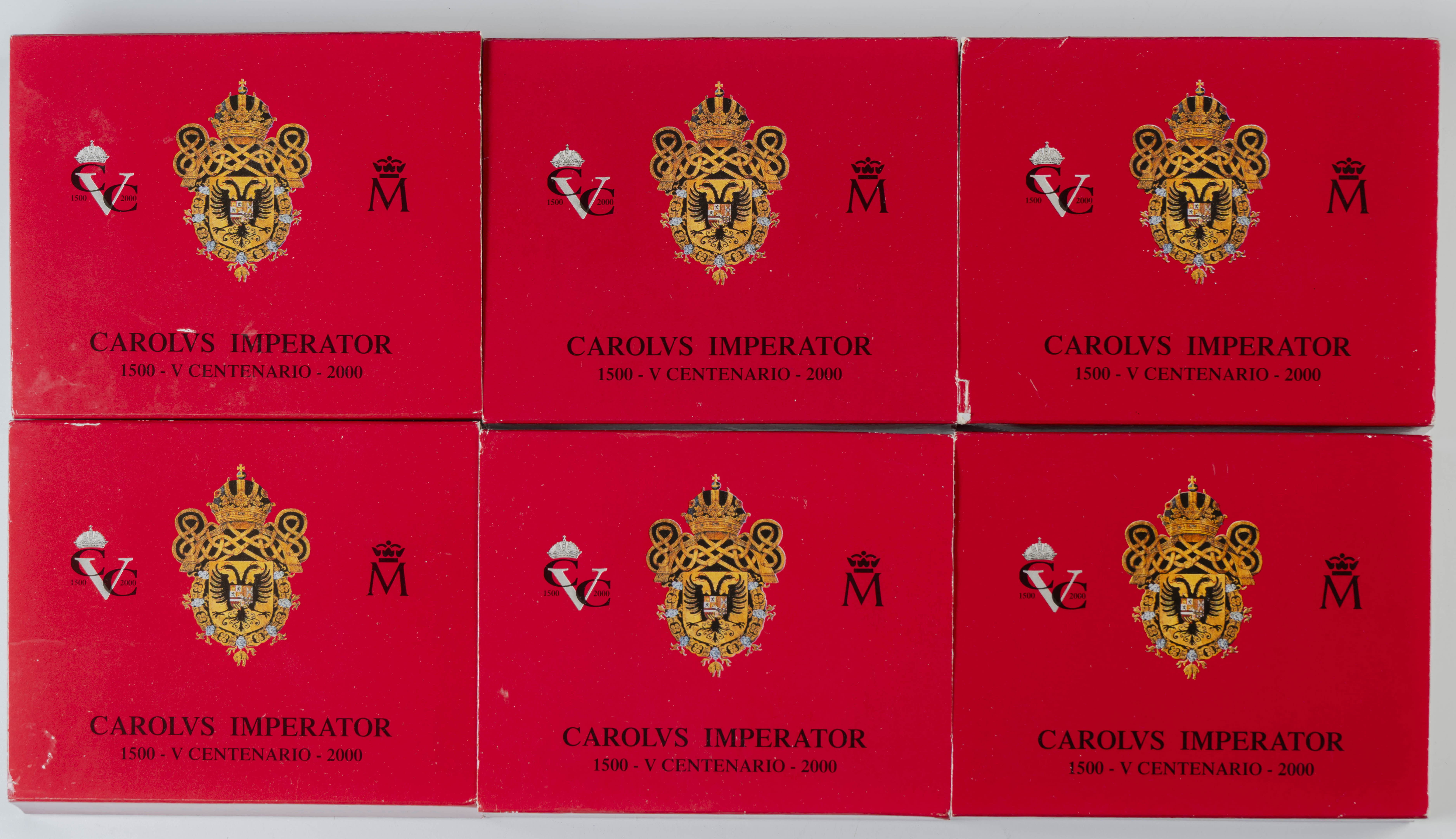JUAN CARLOS I (1975-2014) Set of 6 cases of 2000 Pesetas commemorating the 5th Centenary of Charles V (1500-2000). 2000. FNMT. All different. PROOF. Includes original case and certificate of authenticity.