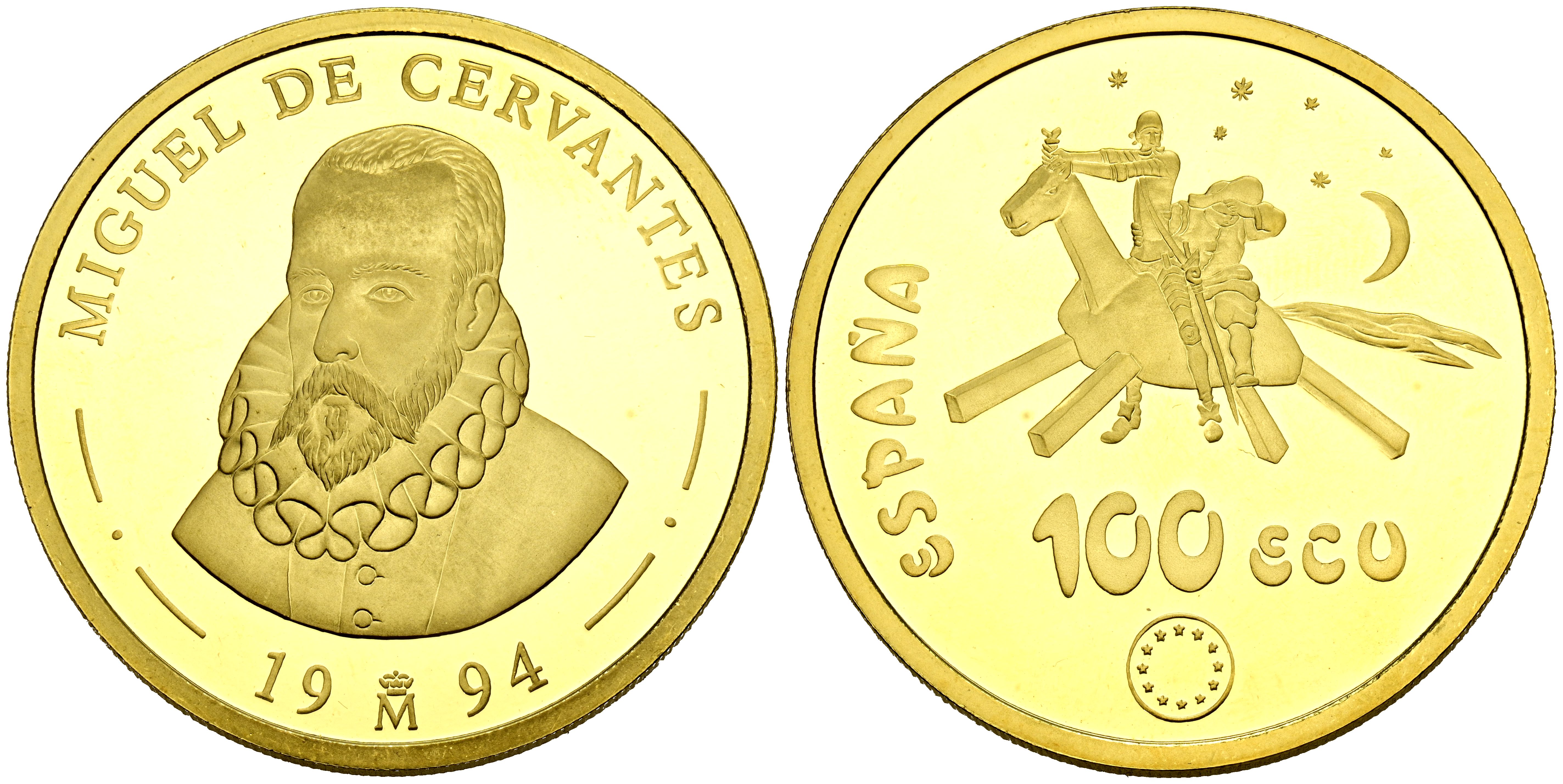 English JUAN CARLOS I (1975-2014). 100 Ecu. (Au. 34.60g/40mm). 1994. Miguel de Cervantes. FDC. Small, light scratches on the reverse.