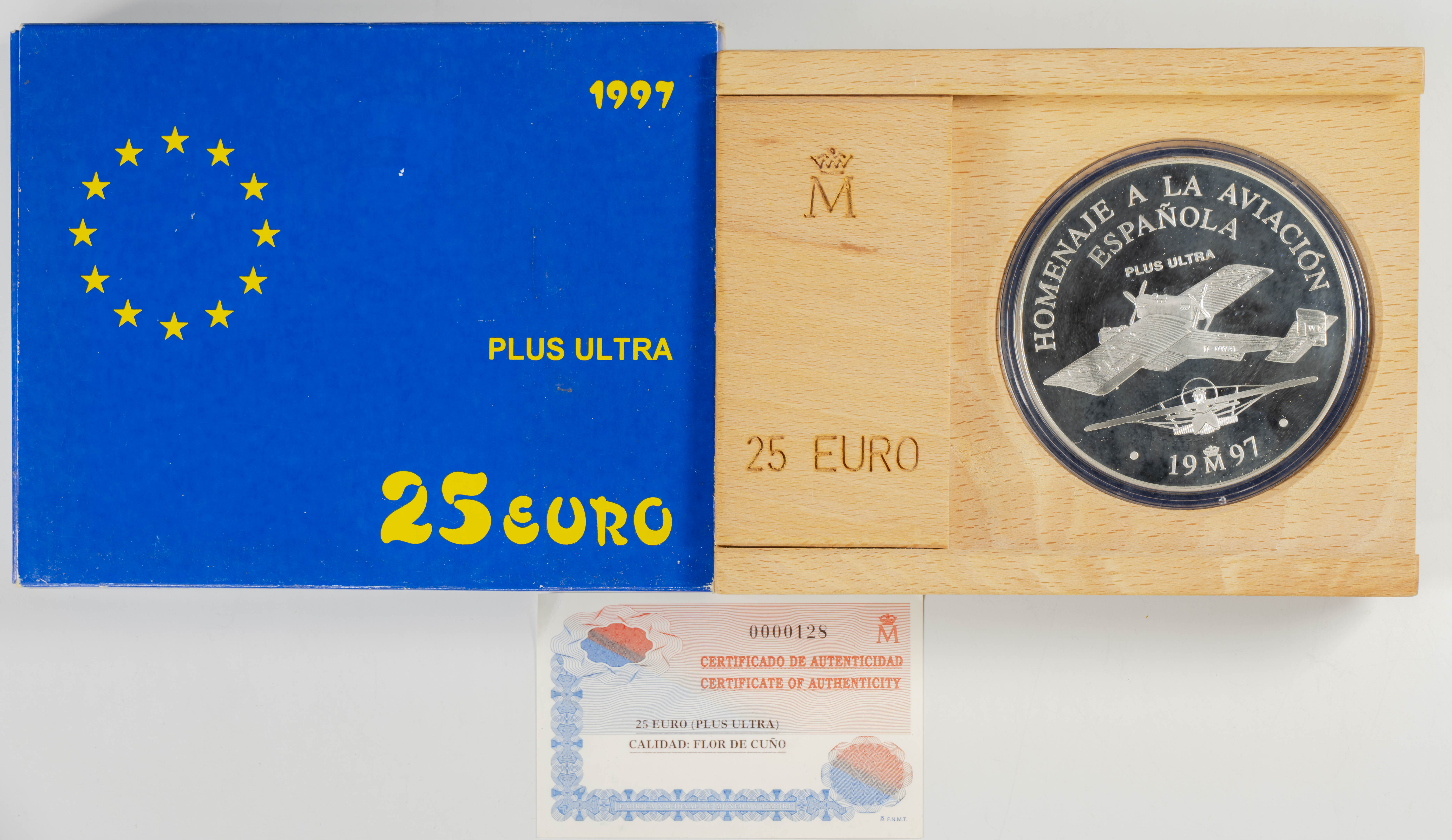 English JUAN CARLOS I (1975-2014). 25 Euro. (Ar. 168.75g/73mm). Spanish Aviation Series. Plus Ultra. 1997. FNMT. FDC. Presented in an official case and with a certificate of authenticity.