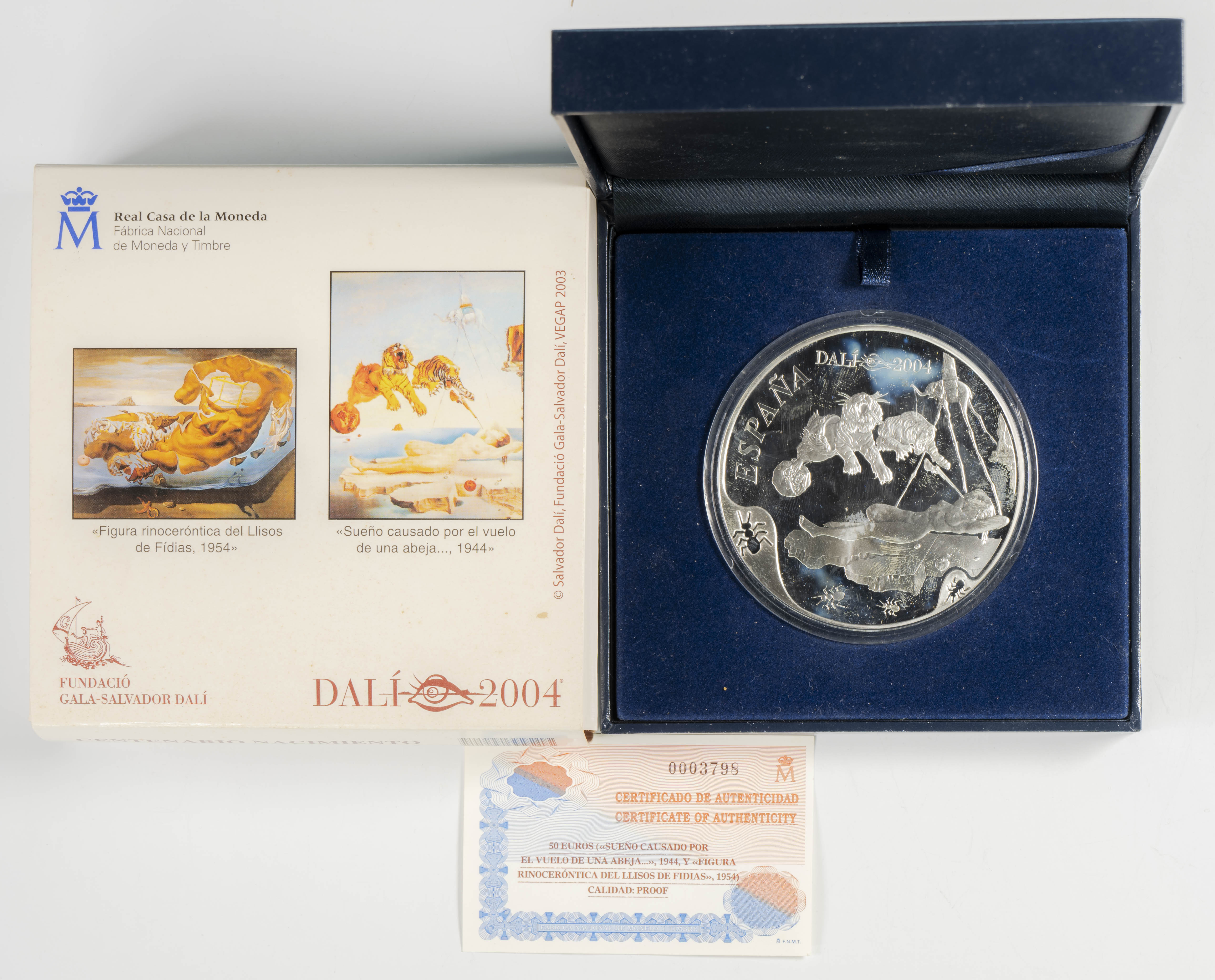 JUAN CARLOS I (1975-2014). 50 Euros. (Ar. 168.75g/73mm). Centenary of the Birth of Salvador Dalí. 2004. FNMT. PROOF. Includes original box and certificate of authenticity. Edition of 12,000.