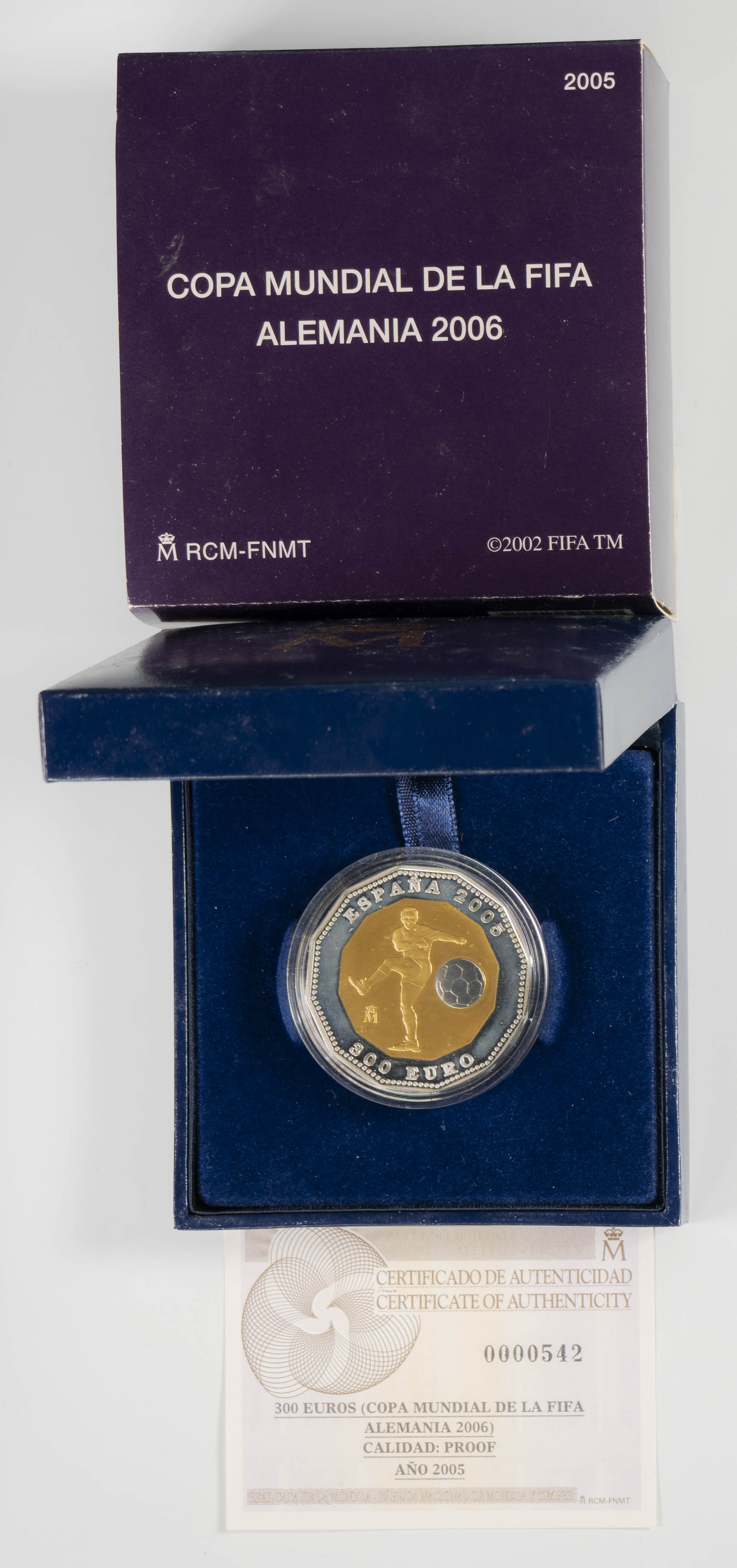 JUAN CARLOS I (1975-2014). 300 Euros. (Au-Ar. 28.80g/40mm). 2005. FNMT. 2006 FIFA World Cup Germany. Bimetallic coin, gold center, weight: 17.26g and silver outer zone, weight: 11.54g. PROOF. Mintage of 8,000. Includes original case and certificate of authenticity.