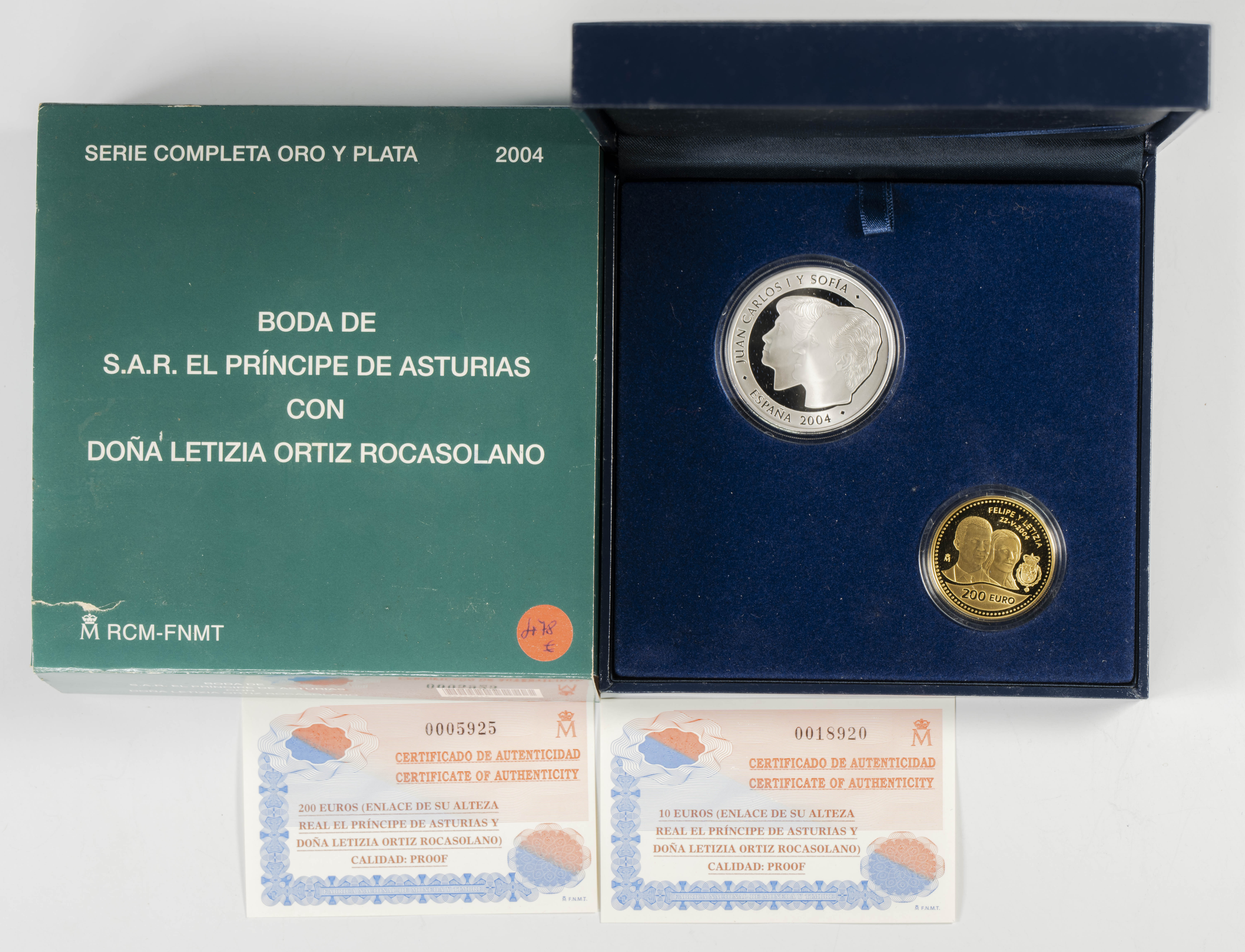 English Juan Carlos I (1975-2014). Wedding of HRH the Prince of Asturias. Complete set in gold and silver. 2004. FNMT. Includes two coins: one €10 silver coin and one €200 gold coin. PROOF grade. Includes original case and certificates of authenticity.