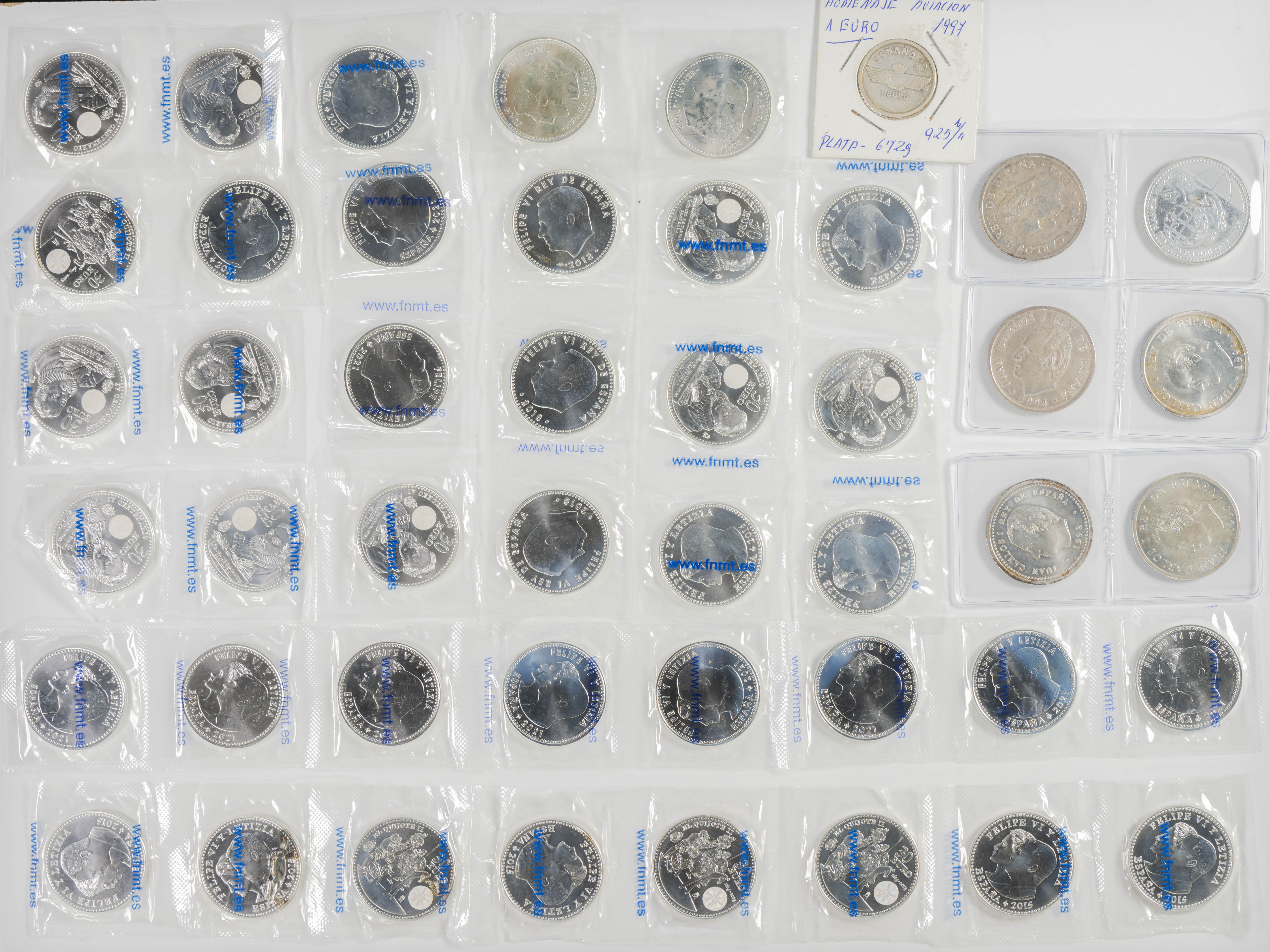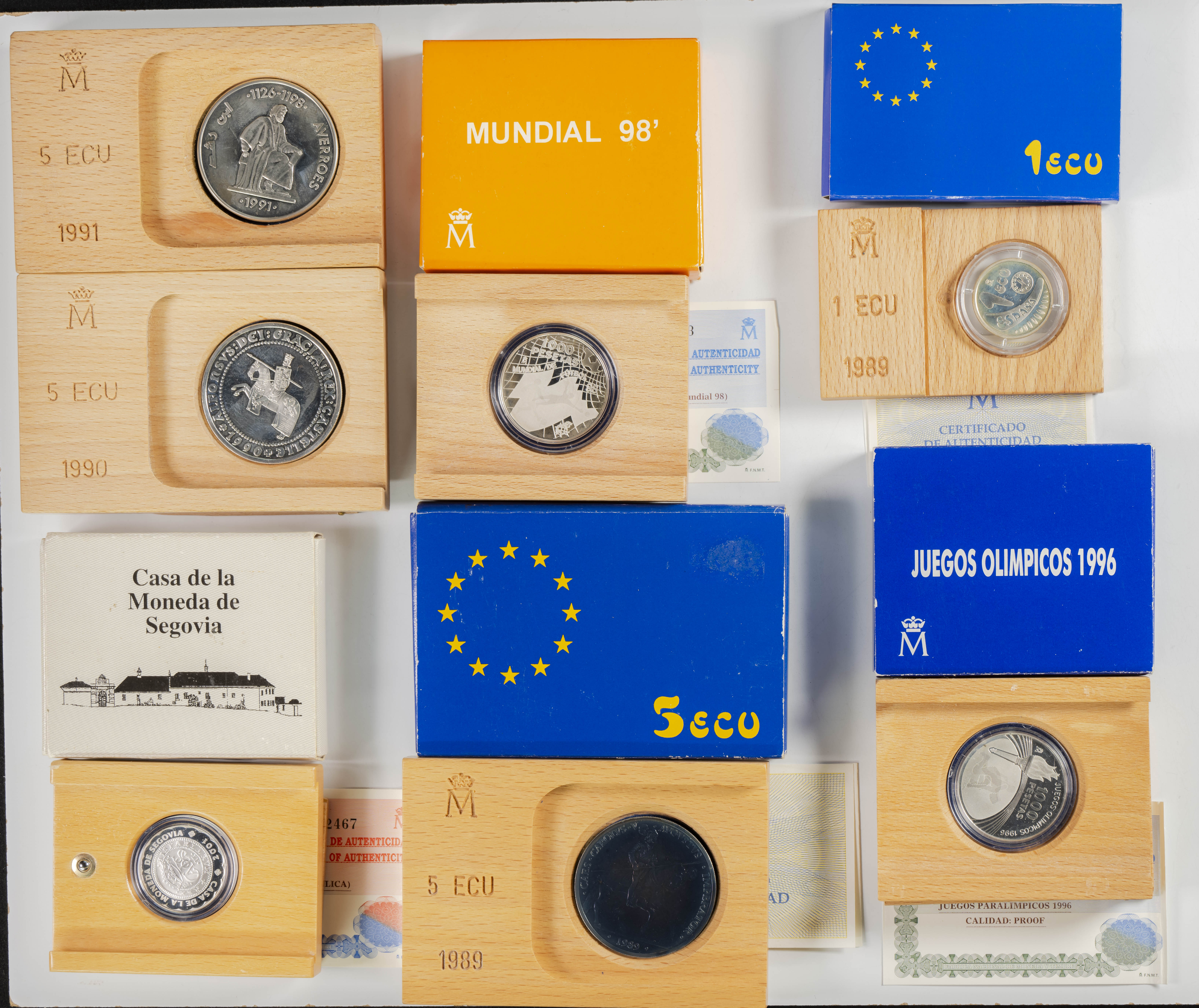 English SPAIN. Excellent set consisting of more than 90 silver coins in different denominations, among which we highlight the €40 (2), €30 (67), €12 (5) and 2000 Pesetas (11). The set is completed with seven boxes of Ecus and Pesetas. The set is in excellent condition overall, with a large part of the set in its original unopened blister pack. FOR EXAMINATION.