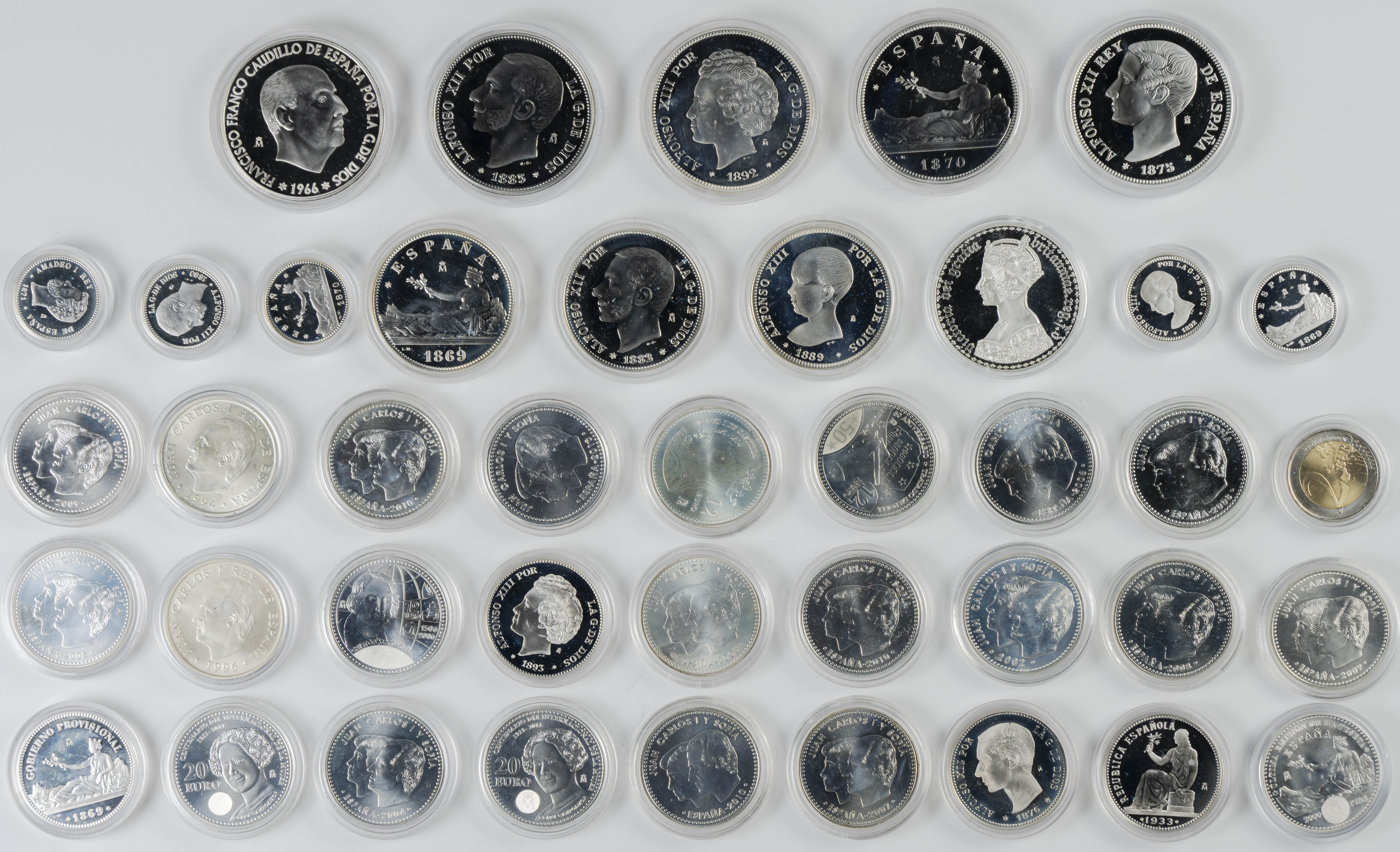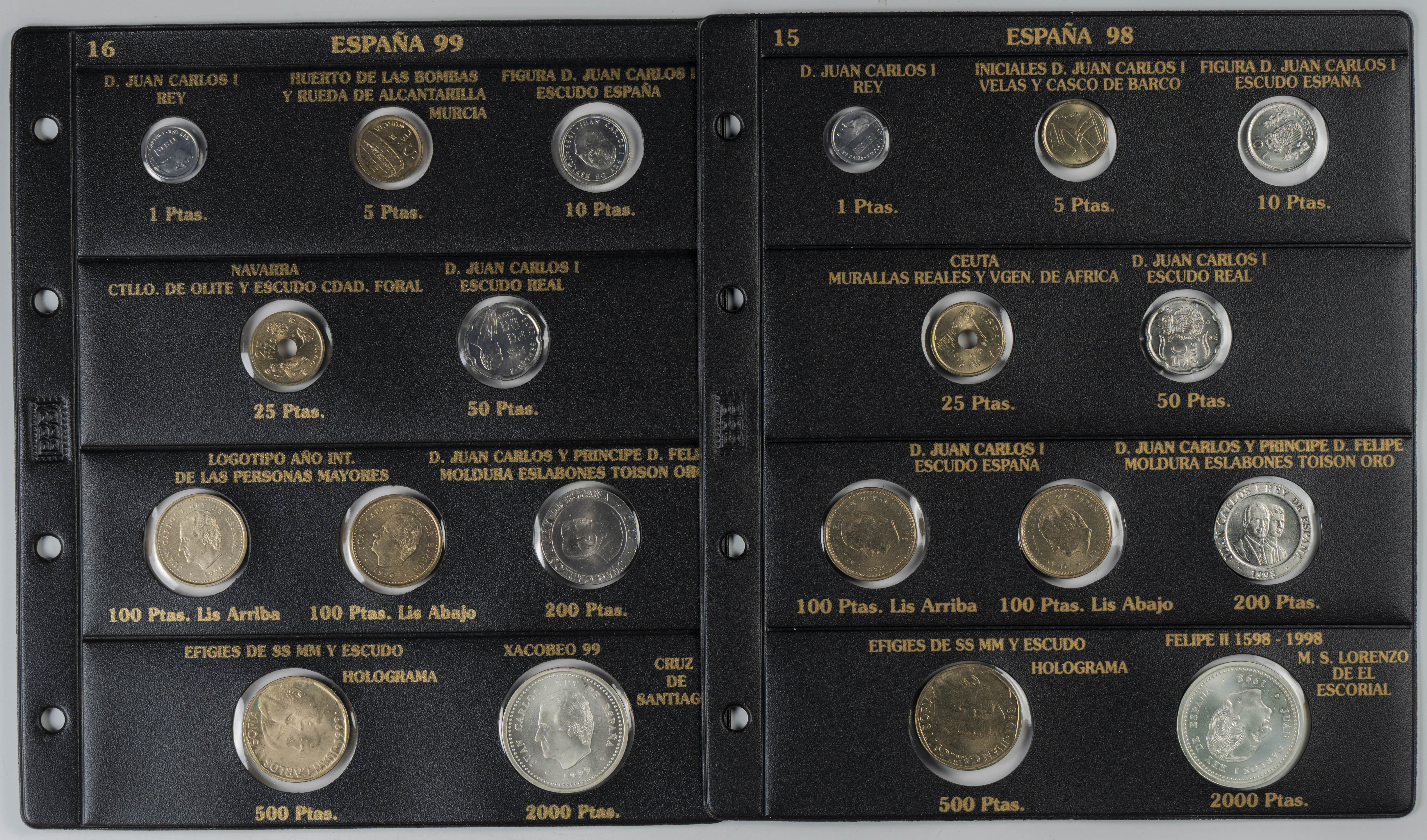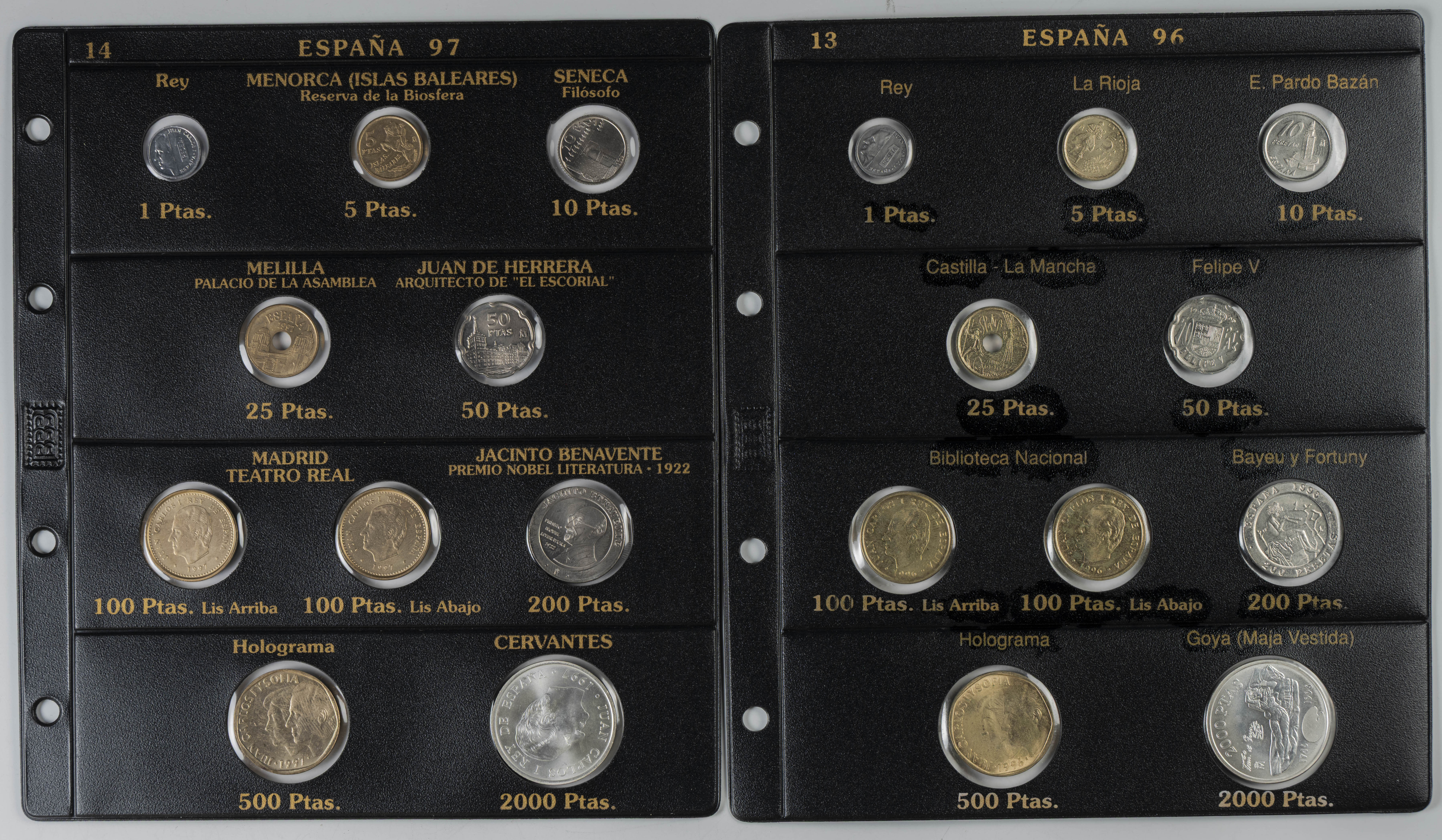 Magnificent collection consisting of dozens of coins, both legal tender and commemorative. Highlights include the complete silver History of the Peseta collection (24 coins with capsules but no case), as well as 22 2000-peseta, 12-euro, and 20-euro coins with different themes. The collection is rounded off with 11 commemorative cases, also in silver, for 1000 pesetas and two albums containing complete sets of Juan Carlos I coins, including several more 2000-peseta coins. Various states of conservation. PLEASE EXAMINE.