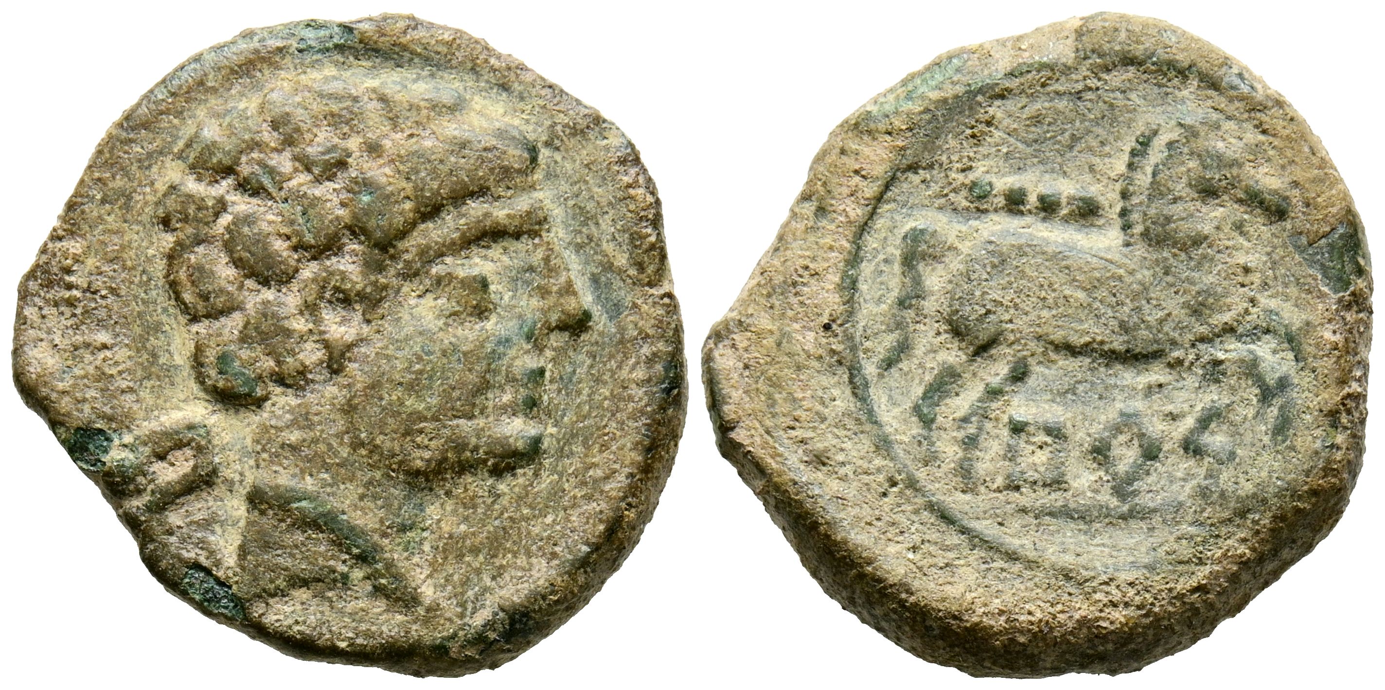 BURSAU (Borja, Zaragoza). Quadrant. (Ae. 5.41g/20mm). 120-80 Fine (FAB-304). Obv: Male head facing right, behind the Iberian letter Bu. Rev: Horse jumping to the right with a bridle, below the Iberian legend: BuR. VF. Rare specimen.