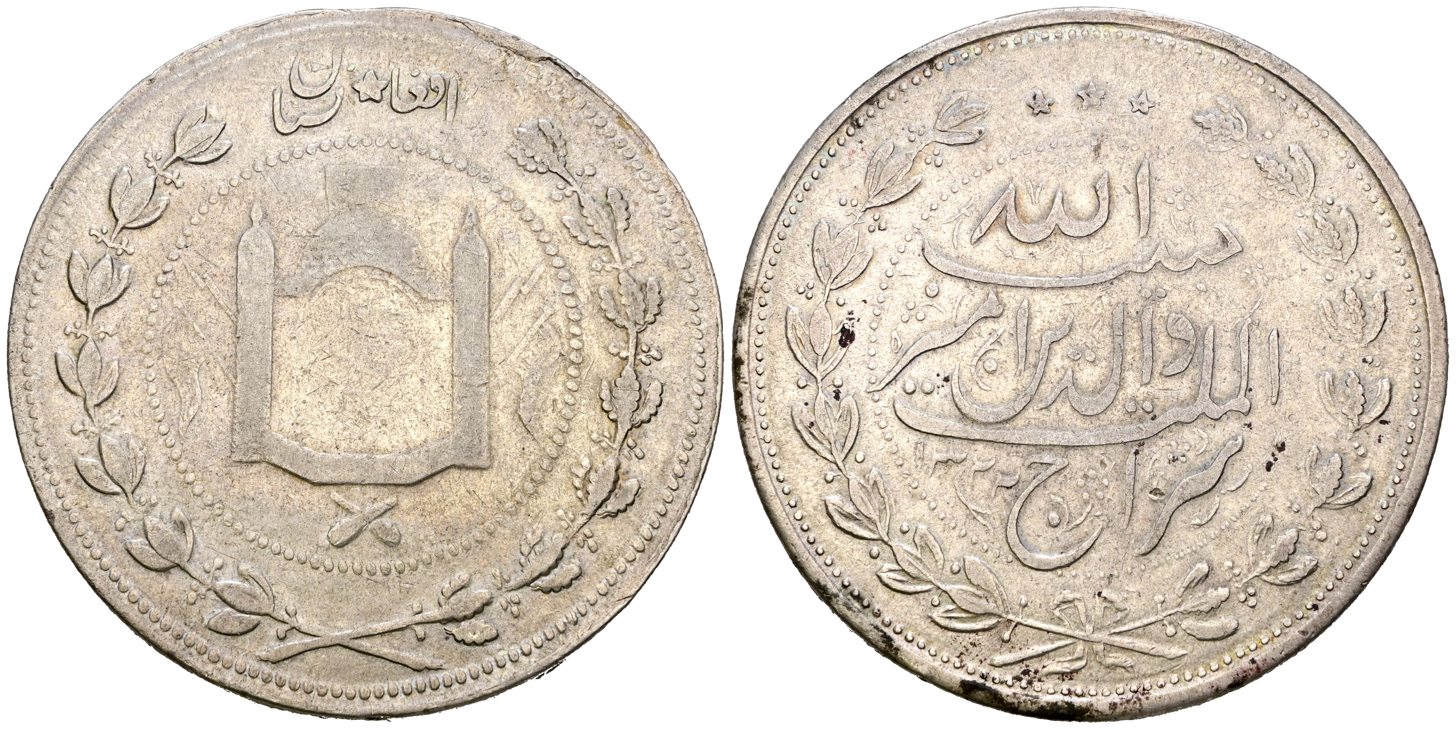 English AFGHANISTAN. 5 Rupees. (Ar. 45.78g/45mm). 1904 (AH 1322). Habibullah. (Km#843). Very Fine.