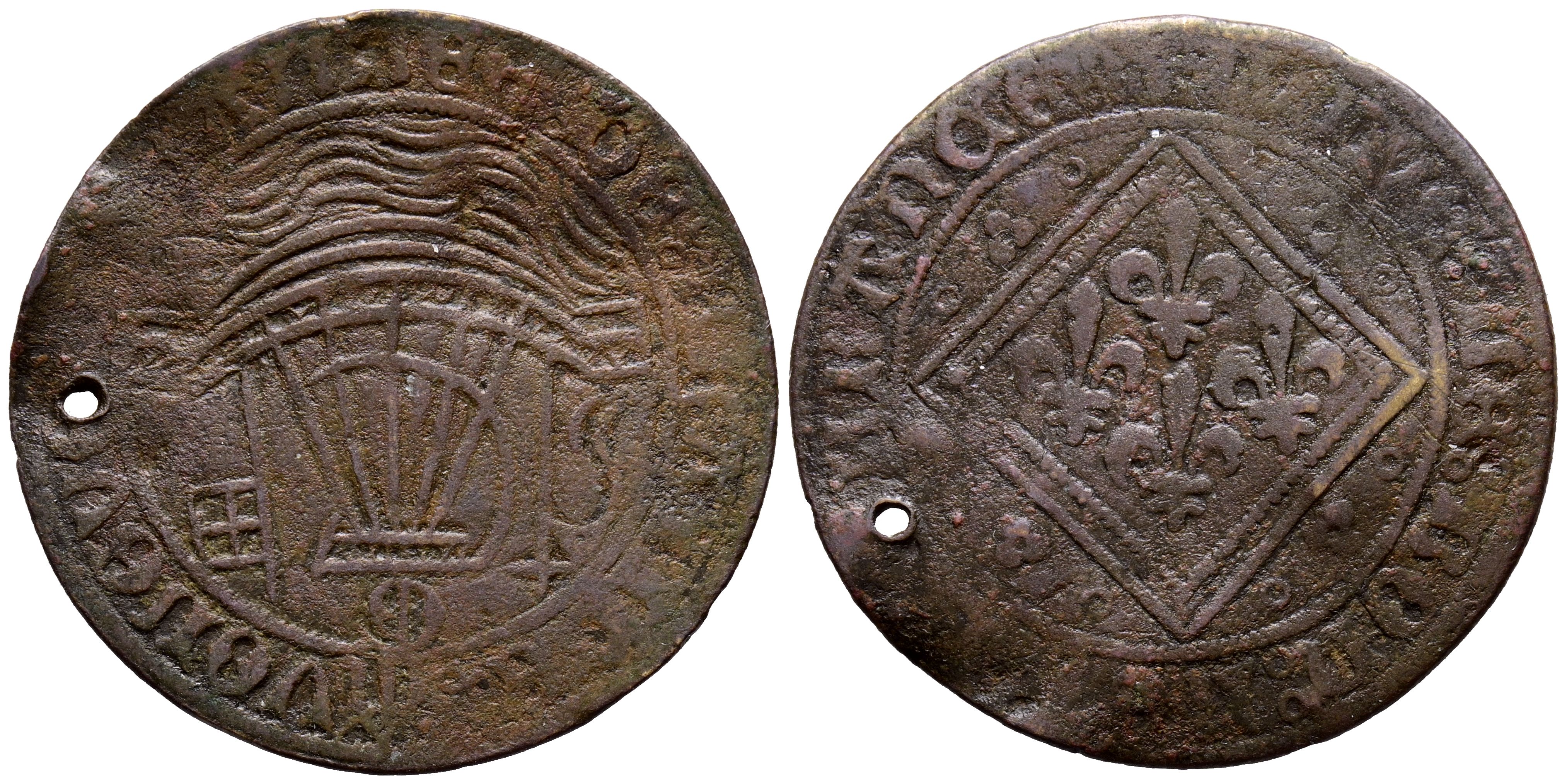 GERMANY, Nuremberg. Jeton. (Ve. 3.08g/26mm). 16th century. (Mitchiner does not mention this, but based on the type, this specimen was minted between 1480 and 1485). VF-. Small hole.