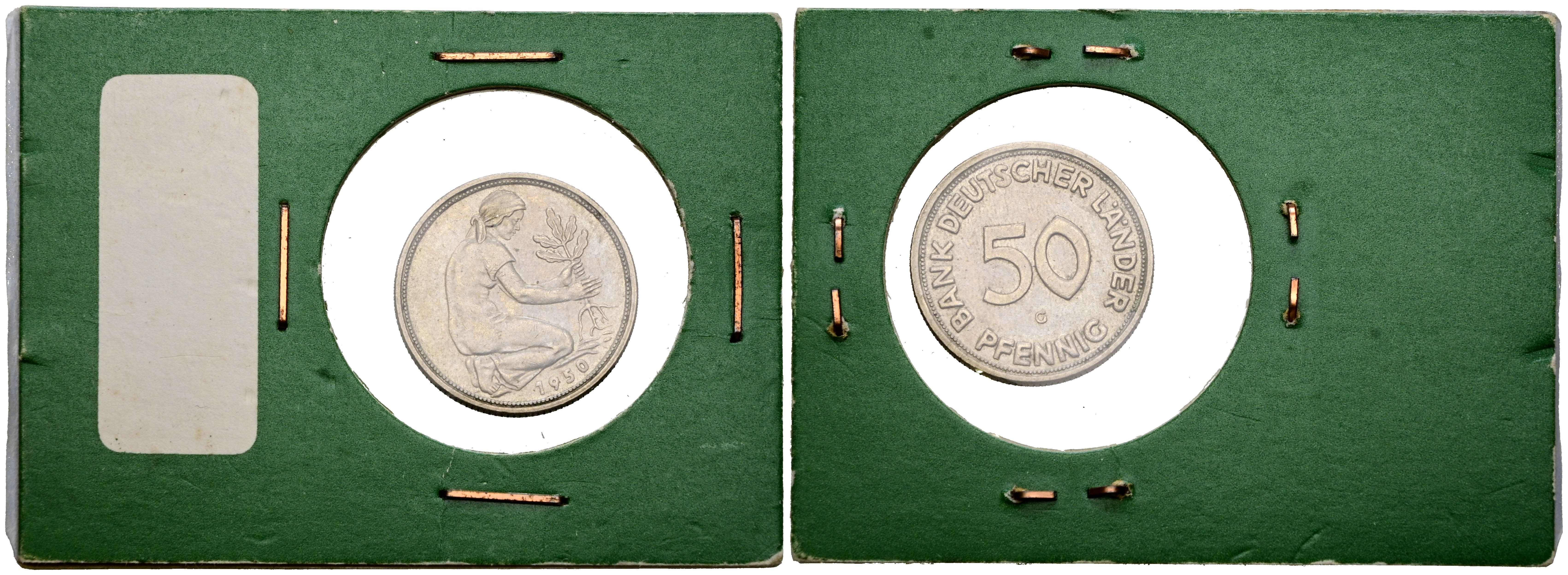 GERMANY. 50 Pfennig. (Ae-Ni. 3.50g/18mm). 1950. Karlsruhe G. Bank Deutscher Länder. (Km#104). Extremely Fine. The Deutsches Bank for the Federal States (BdL) was founded in Frankfurt in March 1948 and assumed the central function of monetary policy in the British and American zones after World War II. Later, in 1948, the French zone and its regional central banks also joined. Until 1951, it was subject to the instructions of the Western Allies and from then on was formally independent, even from the federal governments. It wasn't until 1957 that the Deutsches Bank for the Federal States was replaced by the Bundesbank. The appearance in the legend of the name of the Bank and not the country (Bundesrepublik Deutschland) is a significant difference from other coins from the same years and even mints. However, this fact does not make this coin unusual, but rather the fact that the 1950 mintage from the Karlsruhe mint seems never to have been issued, and its minting was due to an error, intentional or not, by one or more officials at that mint.