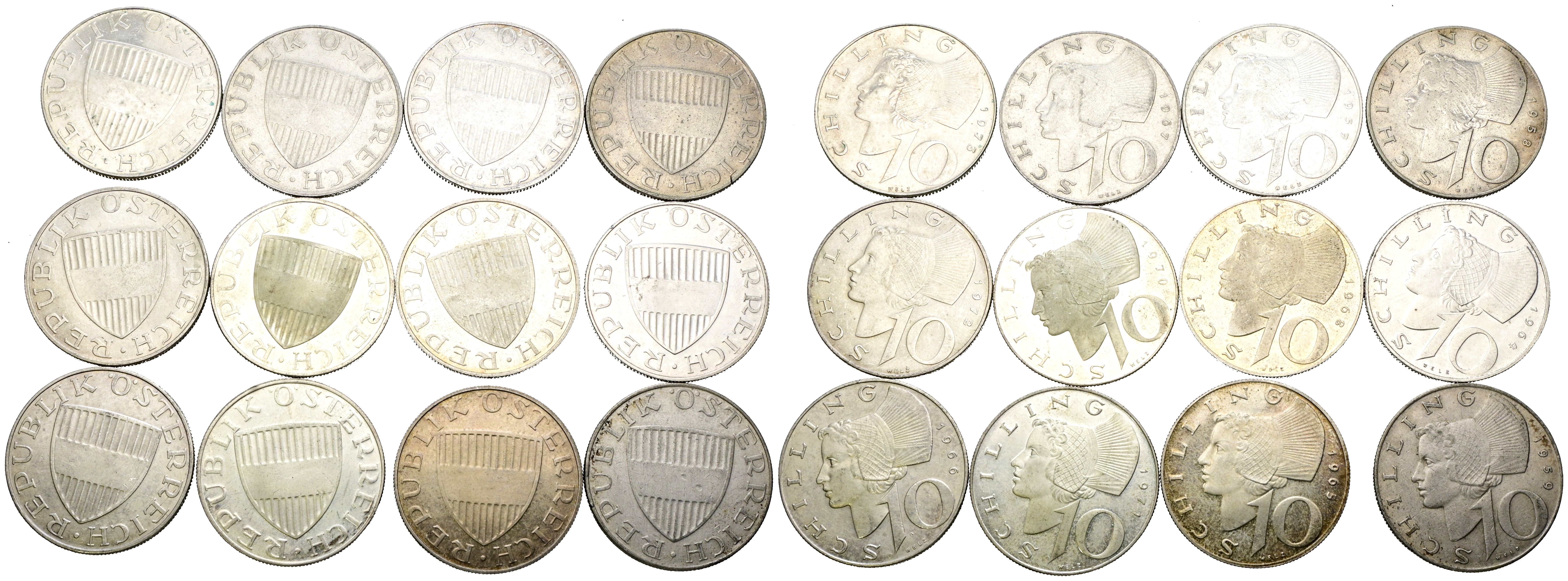 AUSTRIA. Set of 12 silver 10 Schilling coins minted between 1957 and 1973. No duplicate pieces. Varying states of preservation. FOR EXAMINATION.