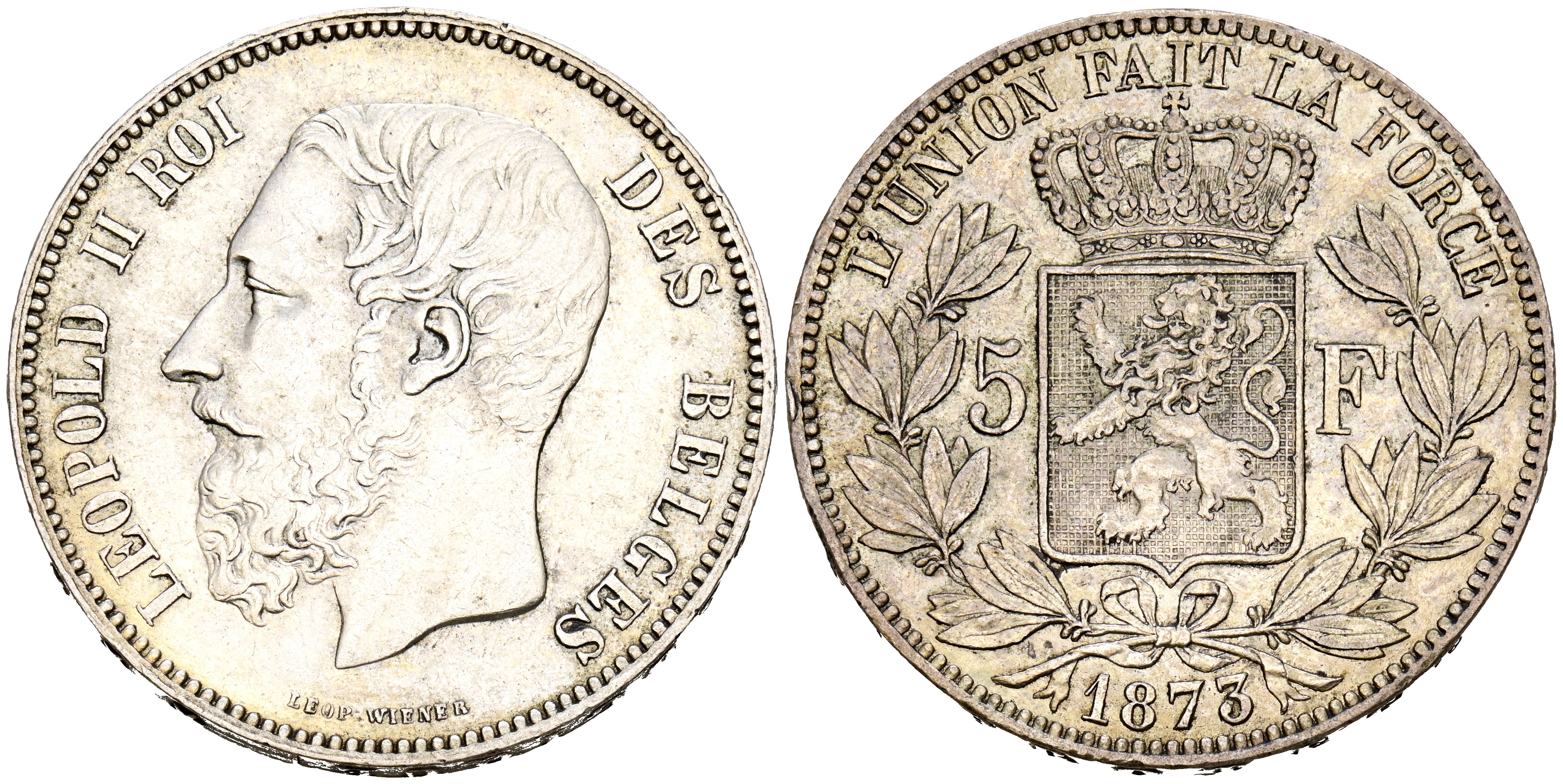 BELGIUM, Leopold II. 5 Francs. (Ar. 24.97g/37mm). 1873. (Km#24). Good Very Fine.