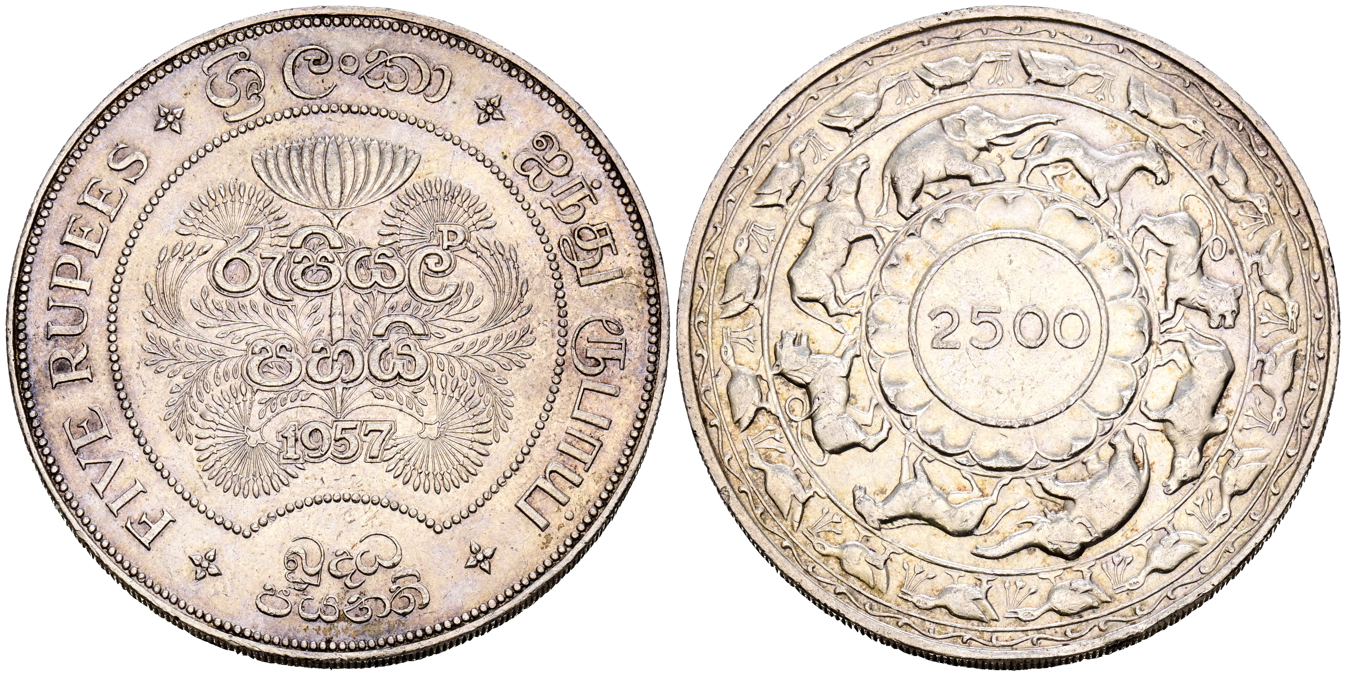 CEYLON (Sri Lanka). 5 Rupees. (Ar. 28.26g/39mm). 1957. 2500th Anniversary of Buddhism. (Km#126). VF+.