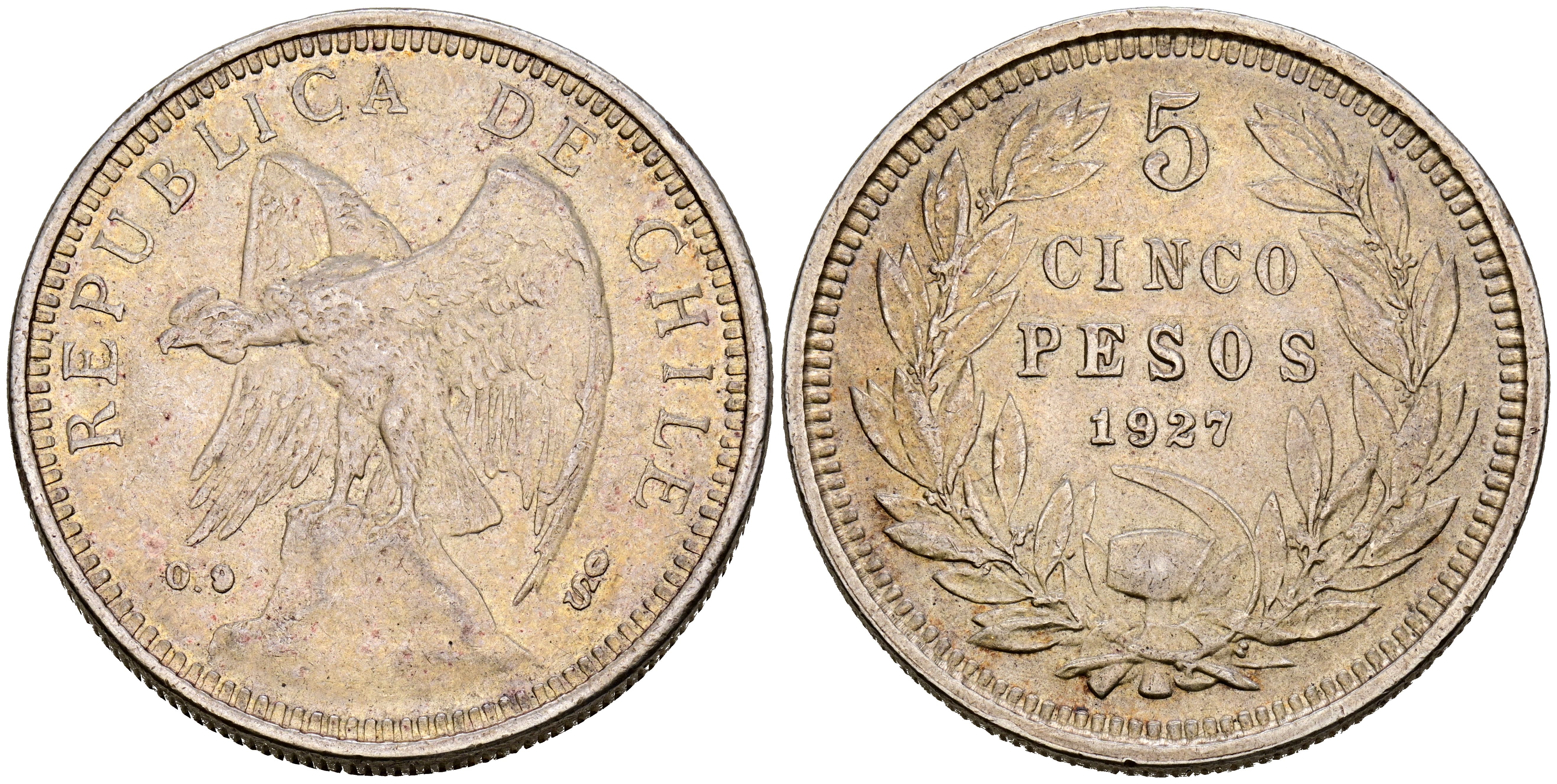 English CHILI. 5 Pesos. (Ar. 25.07g/37mm). 1927. Santiago. (Km#173.1). Good Very Fine.