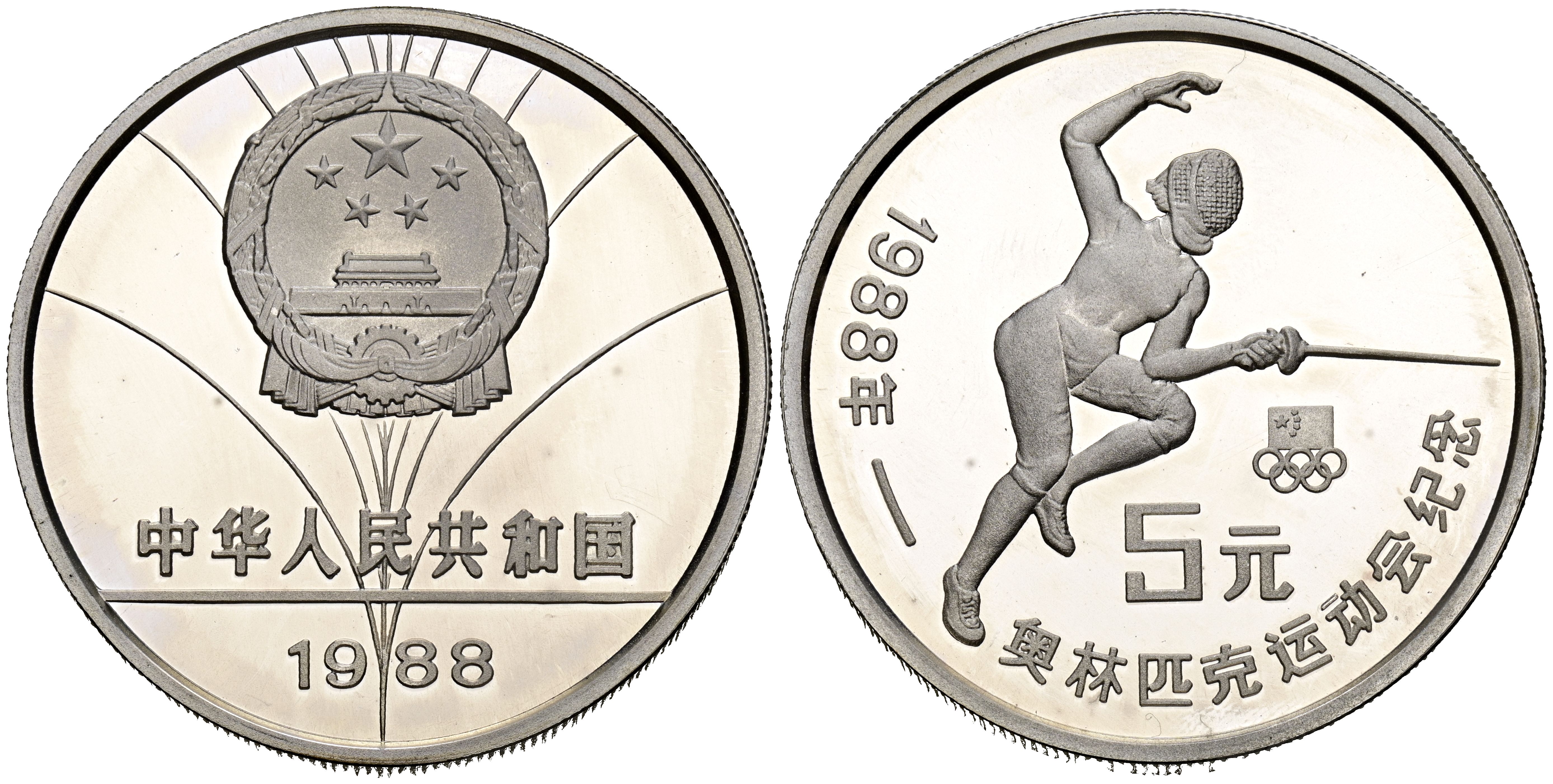CHINA. 5 Yuan. (Ar. 30.02g/39mm). 1988. Seoul 1988 Olympic Games. Fencing. (Km#204). PROOF.