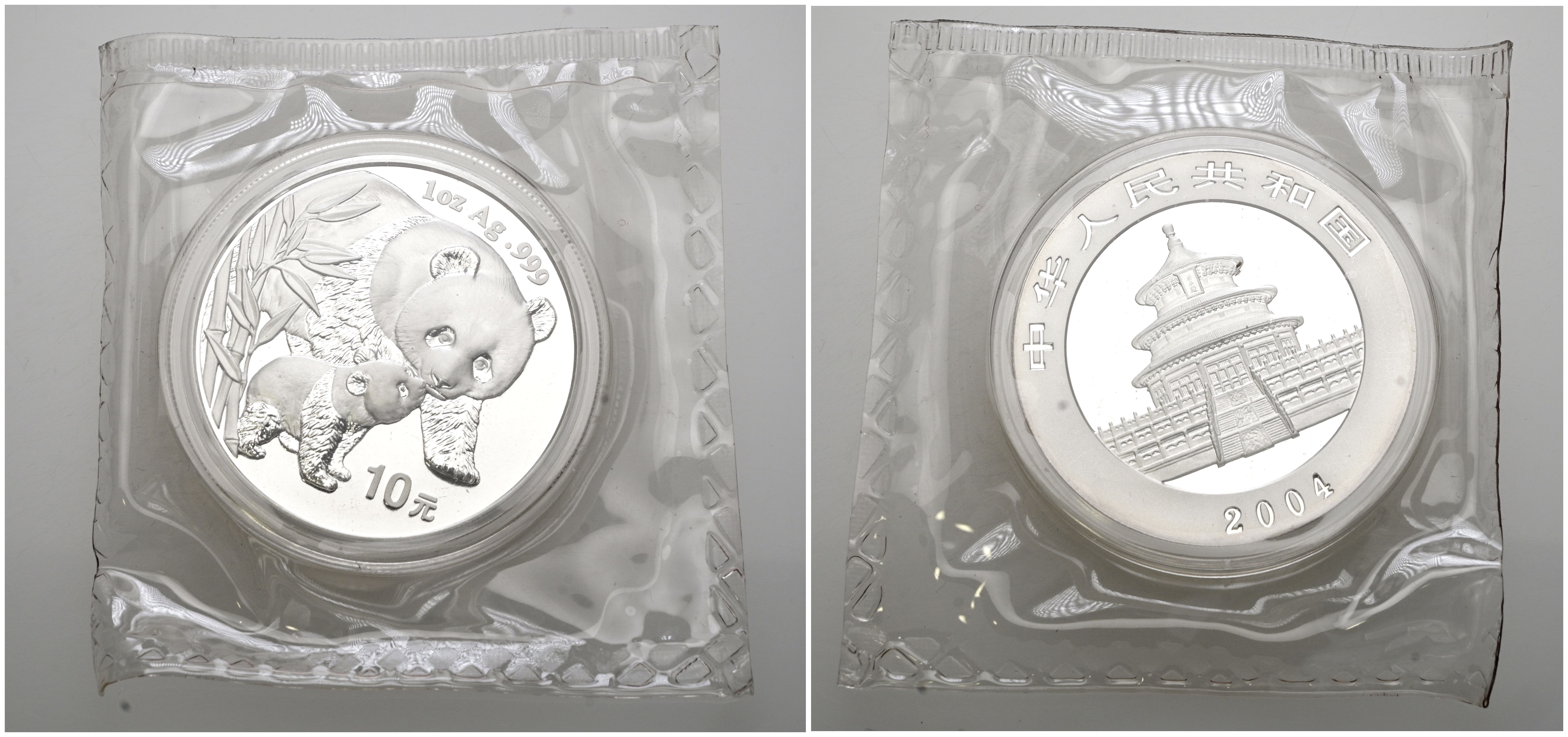 English CHINA. 10 Yuan. (Ar. 31.10g/40mm)*. 2004. Panda series. (Km#1528). PROOF. In original blister. *Theoretical weight and measurements.