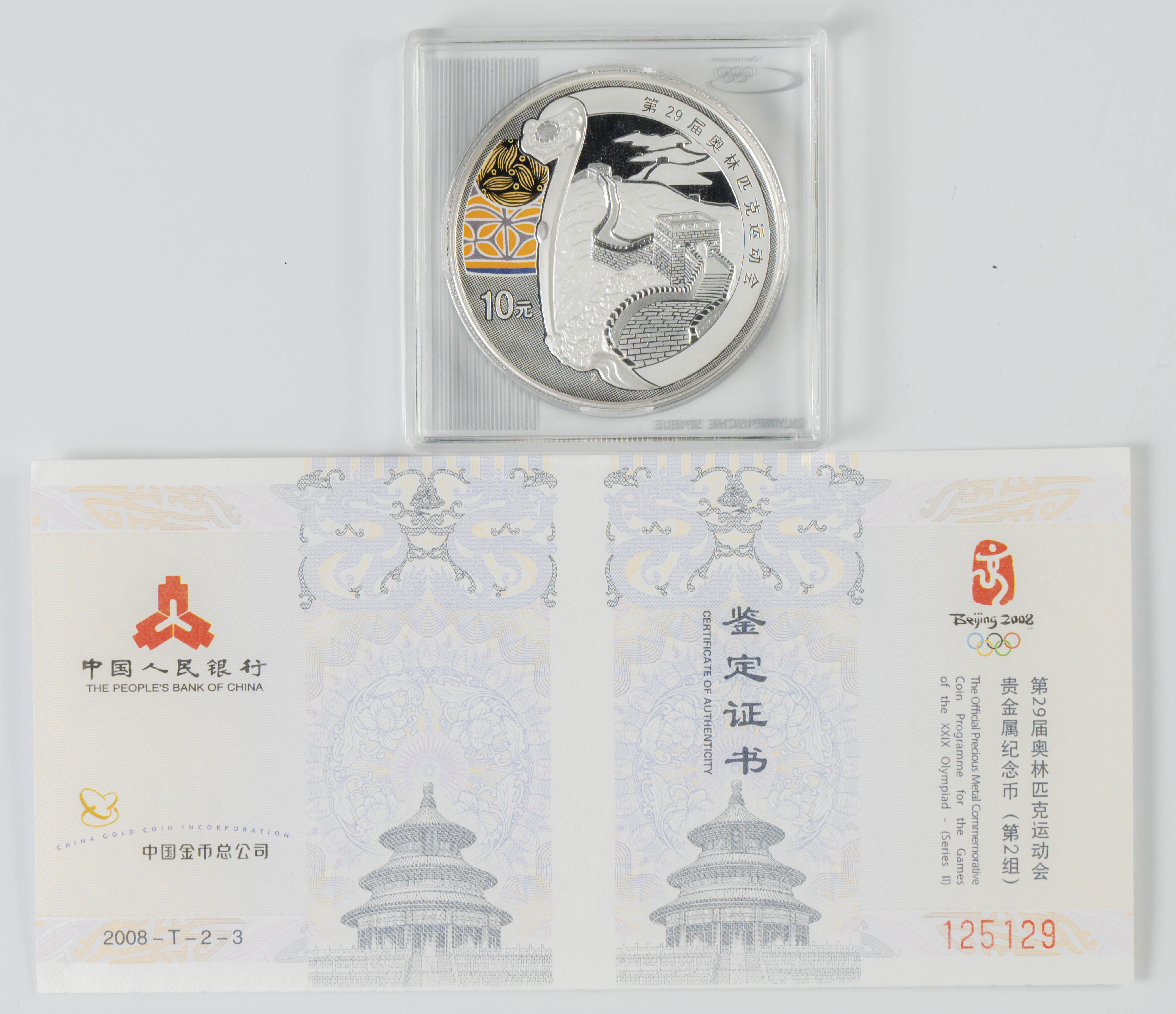 English CHINA. 10 Yuan. (Ar. 31.11g/40mm). 2008. Beijing Olympic Games. Great Wall of China. (Km#1674). PROOF. Includes capsule and certificate of authenticity.