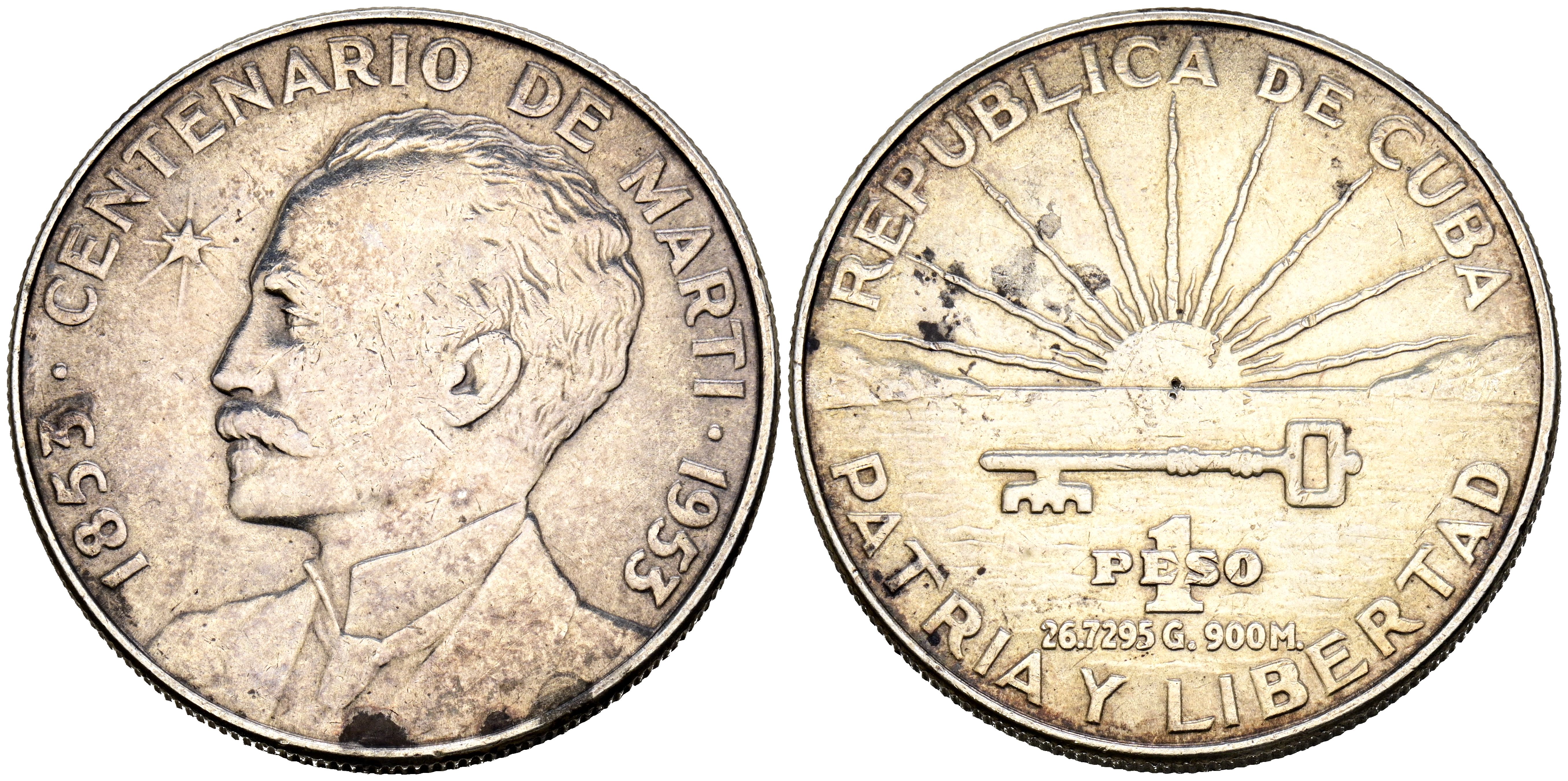 CUBA. 1 Peso. (Ar. 26.68g/38mm). 1953. Centenary of the Birth of José Martí (1853-1953). (Km#29). VF+.