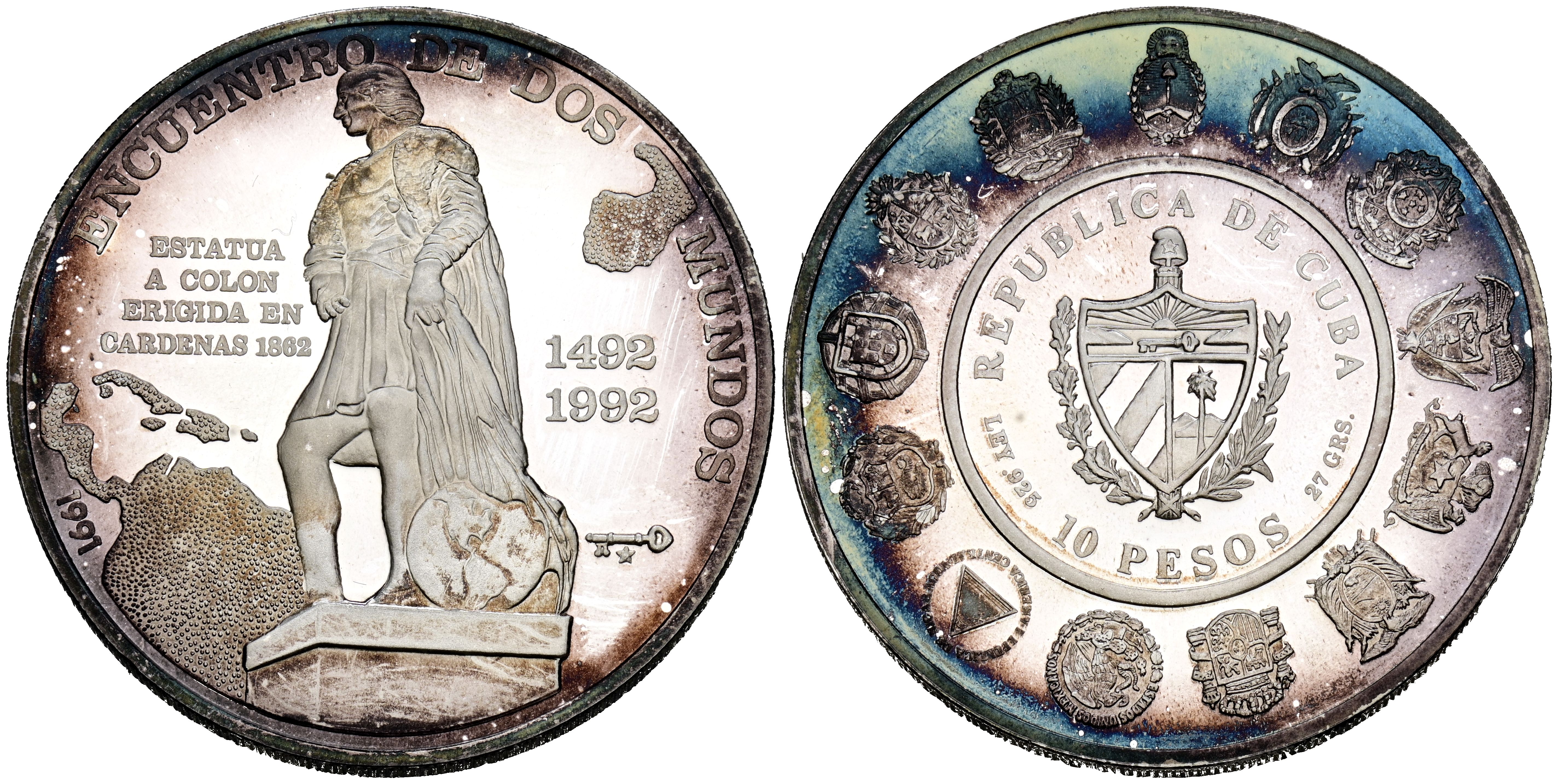 CUBA. 10 Pesos. (Ar. 26.96g/35mm). 1991. Meeting of Two Worlds. (Km#337). PROOF. Beautiful blue patina. Scarce.